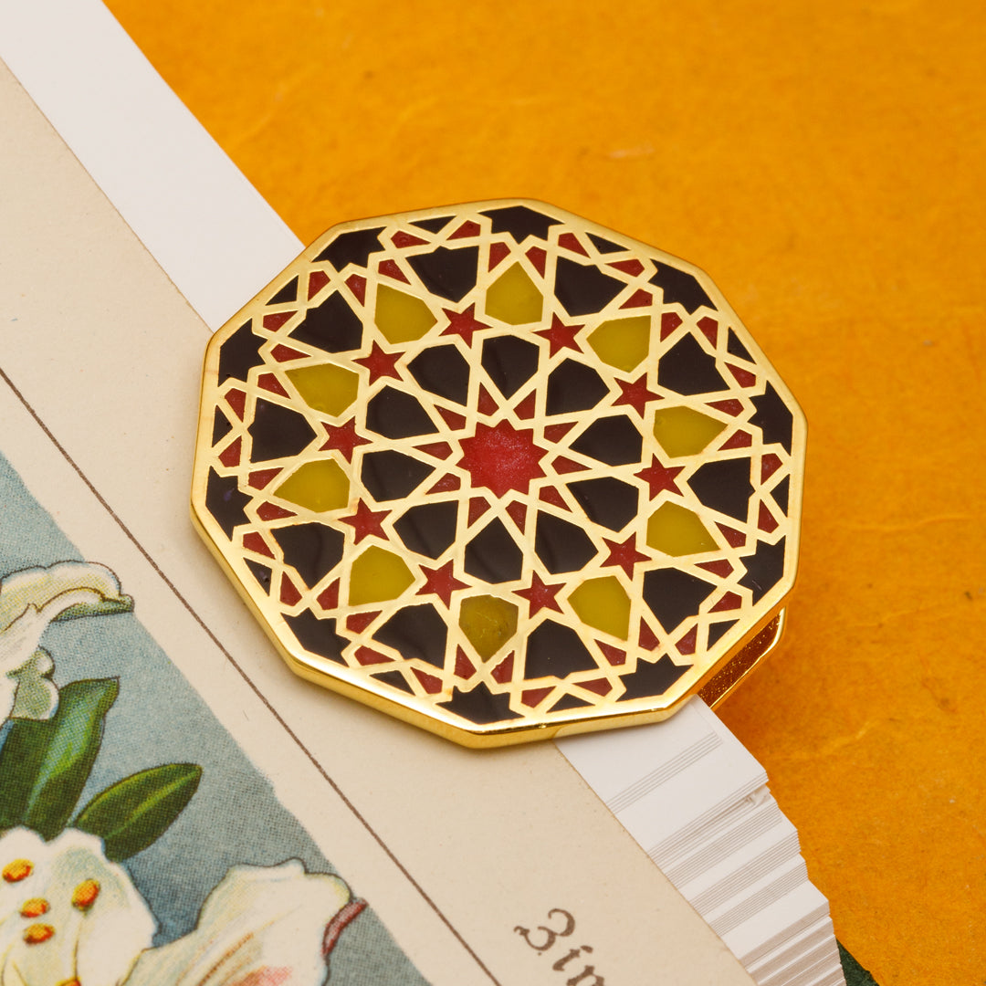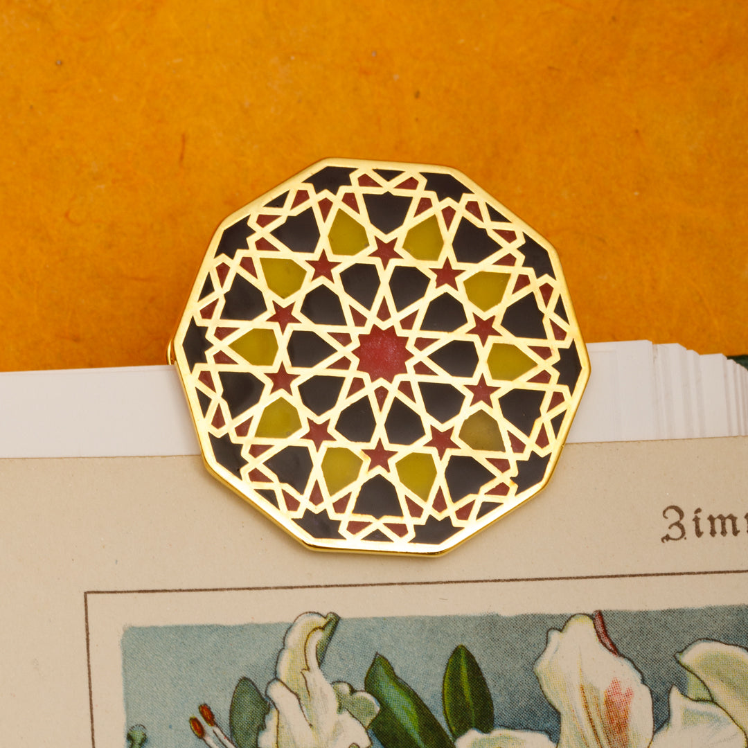 Ongen formdaki bu klips, kağıt tutucu; pirinç materyal üzerinde turuncu bordo sarı minesi ve nikel kaplaması ile sadece işlevsel değil; aynı zamanda estetik bir duruşa da sahip. Selçuklu taş ve çini işçiliğinden ilham alan geometrik yapısı, her bakışta geçmişe bir selam niteliğinde. Özellikle ongen form, Selçuklu mimarisinde cennet tasvirinin simgesi olarak kullanılır; kubbelerde göğe açılan bir geçit gibi yer alır. Bu çokgen yapı, dünyevi olanla ilahi olanı buluşturur. Biz de bu formu, sözlerin, düşüncelerin ve tarihin bir araya gelip saklandığı bu küçük ama anlamlı objede yeniden yorumladık.