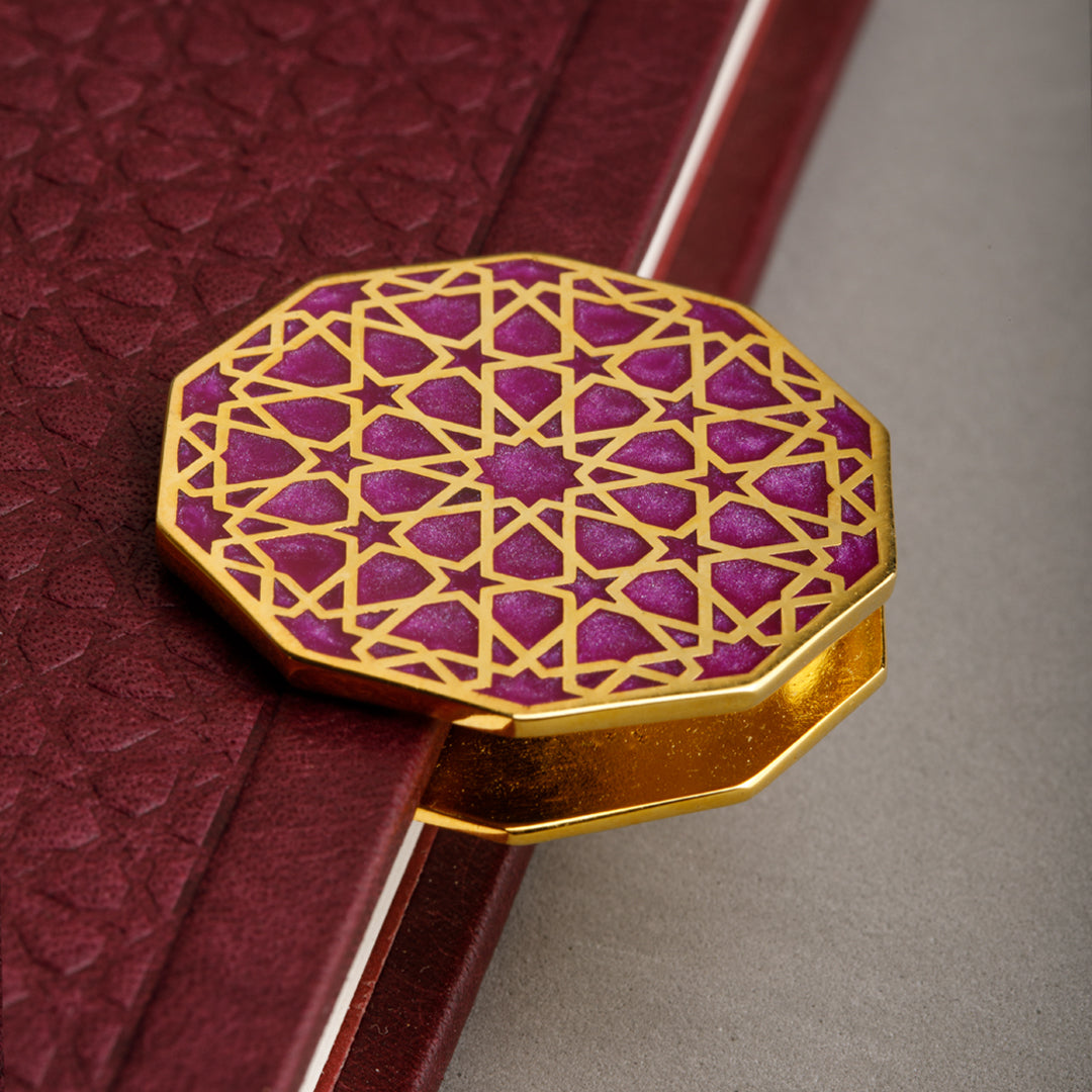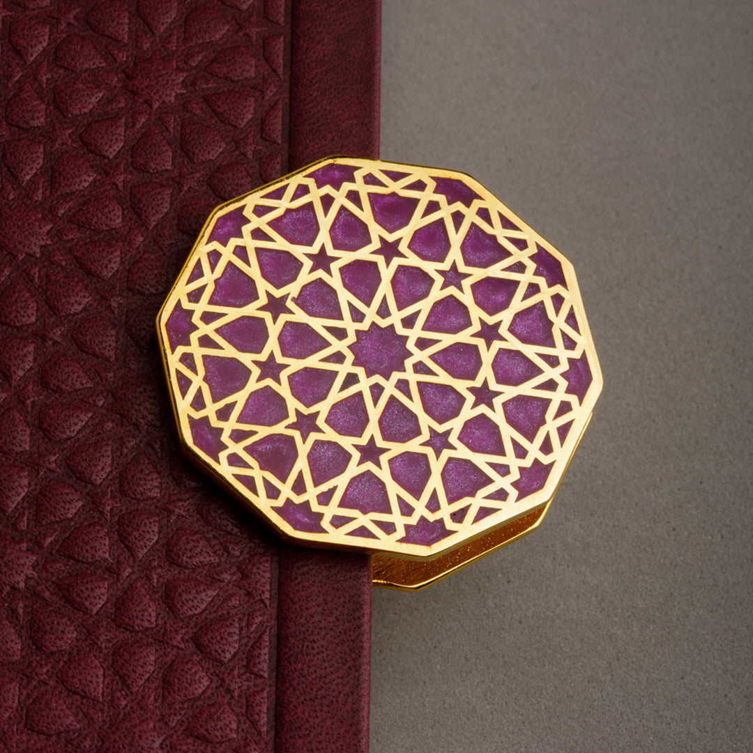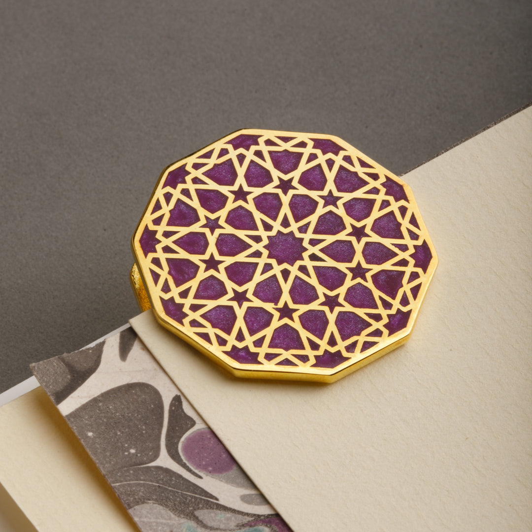 Ongen formdaki bu klips, kağıt tutucu; pirinç materyal üzerinde mor minesi ve nikel kaplaması ile sadece işlevsel değil; aynı zamanda estetik bir duruşa da sahip. Selçuklu taş ve çini işçiliğinden ilham alan geometrik yapısı, her bakışta geçmişe bir selam niteliğinde. Özellikle ongen form, Selçuklu mimarisinde cennet tasvirinin simgesi olarak kullanılır; kubbelerde göğe açılan bir geçit gibi yer alır. Bu çokgen yapı, dünyevi olanla ilahi olanı buluşturur. Biz de bu formu, sözlerin, düşüncelerin ve tarihin bir araya gelip saklandığı bu küçük ama anlamlı objede yeniden yorumladık.