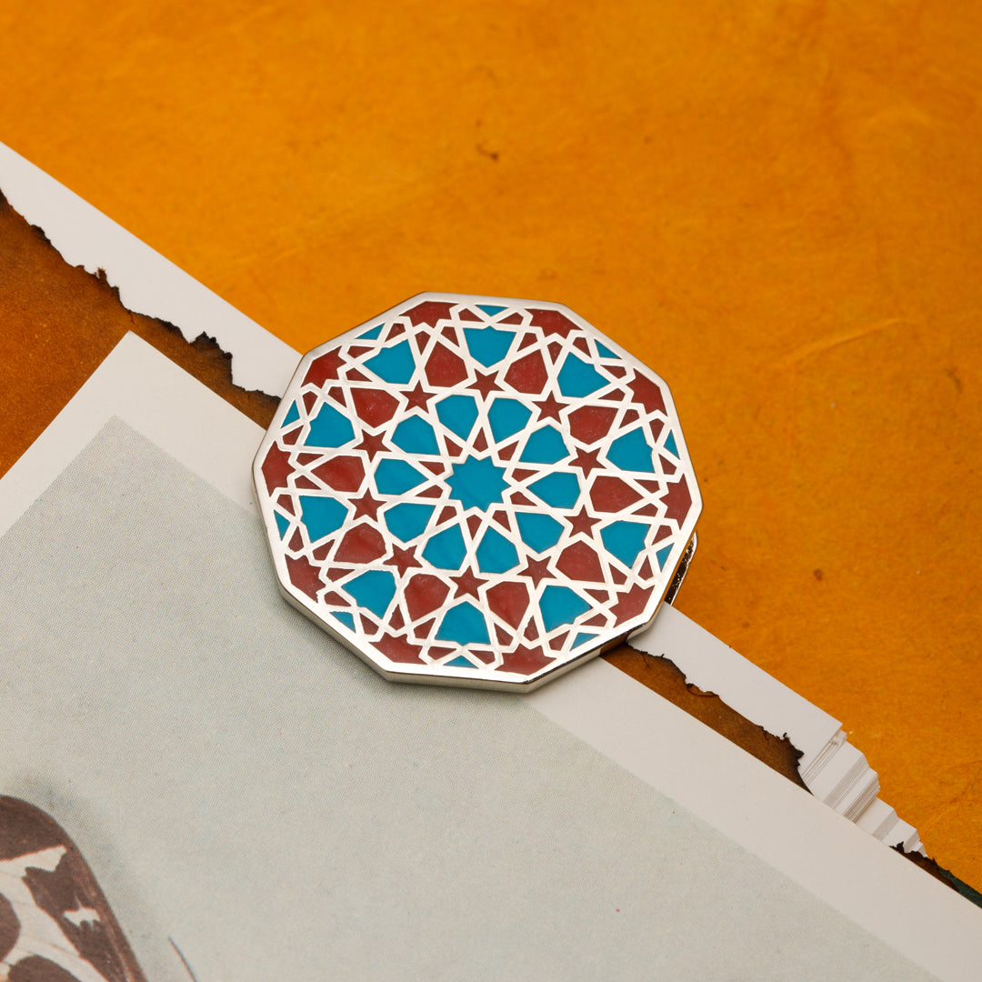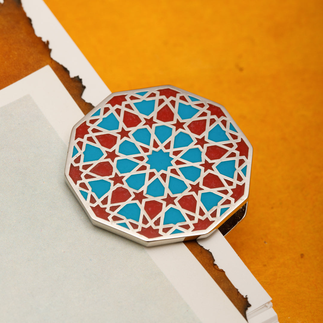Ongen formdaki bu klips, kağıt tutucu; pirinç materyal üzerinde turuncu turkuaz minesi ve nikel kaplaması ile sadece işlevsel değil; aynı zamanda estetik bir duruşa da sahip. Selçuklu taş ve çini işçiliğinden ilham alan geometrik yapısı, her bakışta geçmişe bir selam niteliğinde. Özellikle ongen form, Selçuklu mimarisinde cennet tasvirinin simgesi olarak kullanılır; kubbelerde göğe açılan bir geçit gibi yer alır. Bu çokgen yapı, dünyevi olanla ilahi olanı buluşturur. Biz de bu formu, sözlerin, düşüncelerin ve tarihin bir araya gelip saklandığı bu küçük ama anlamlı objede yeniden yorumladık.