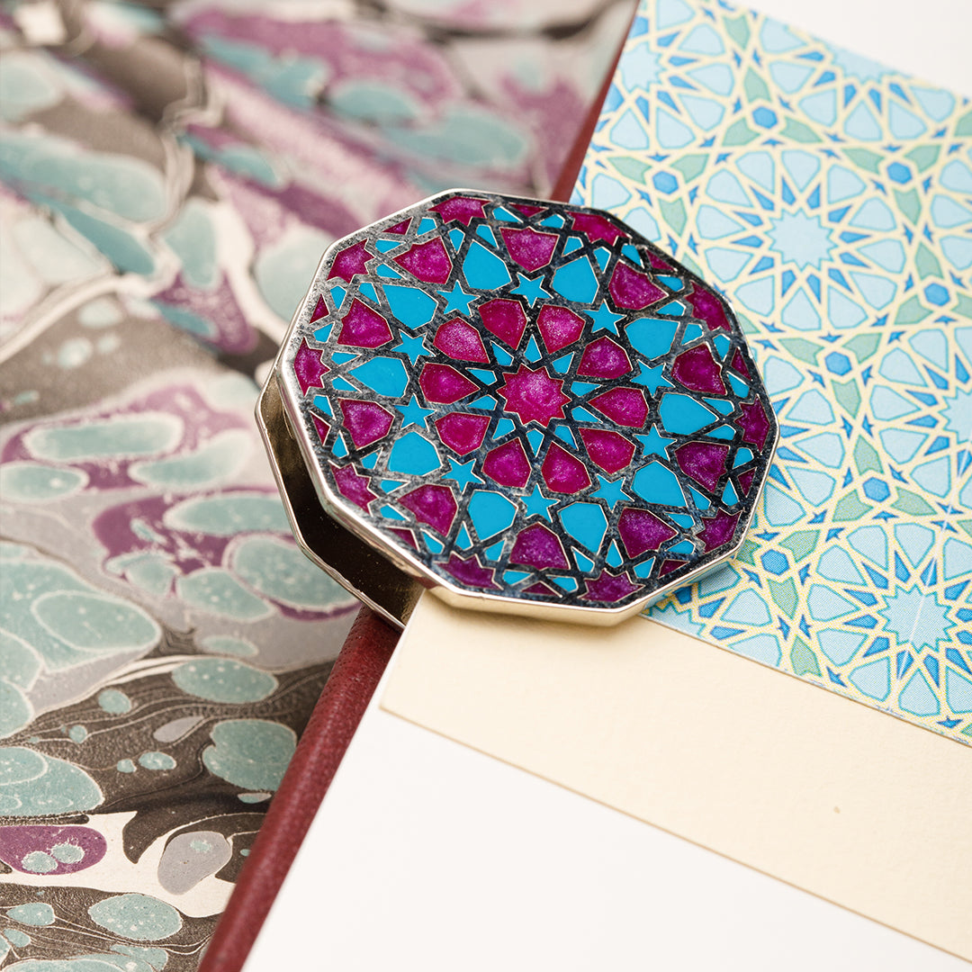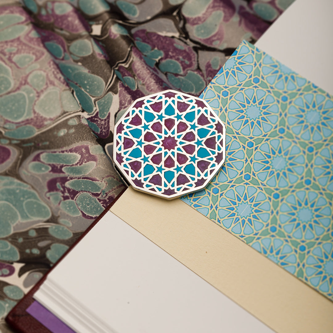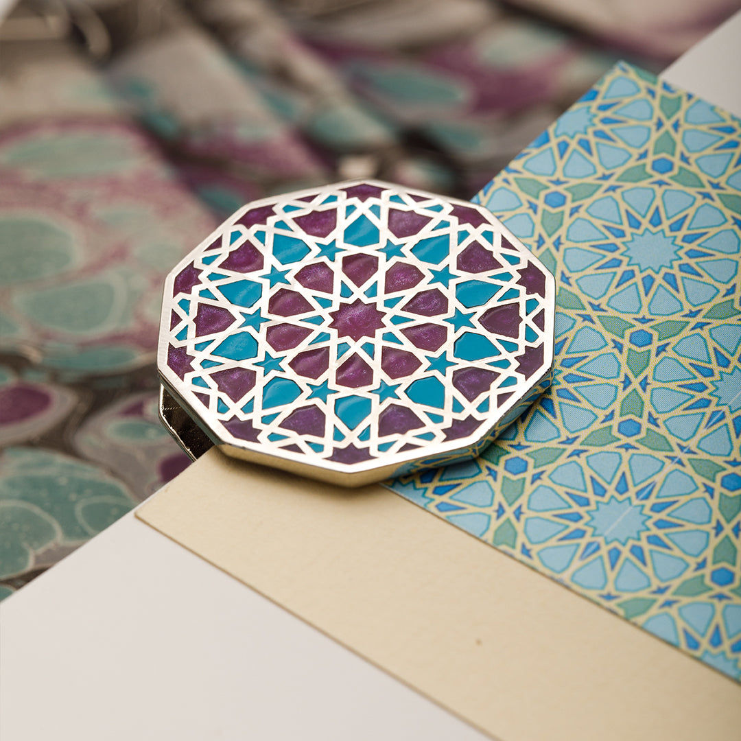 Ongen formdaki bu klips, kağıt tutucu; pirinç materyal üzerinde turkuaz mor minesi ve nikel kaplaması ile sadece işlevsel değil; aynı zamanda estetik bir duruşa da sahip. Selçuklu taş ve çini işçiliğinden ilham alan geometrik yapısı, her bakışta geçmişe bir selam niteliğinde. Özellikle ongen form, Selçuklu mimarisinde cennet tasvirinin simgesi olarak kullanılır; kubbelerde göğe açılan bir geçit gibi yer alır. Bu çokgen yapı, dünyevi olanla ilahi olanı buluşturur. Biz de bu formu, sözlerin, düşüncelerin ve tarihin bir araya gelip saklandığı bu küçük ama anlamlı objede yeniden yorumladık.