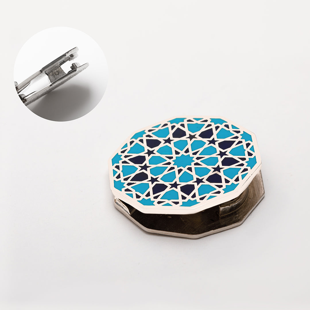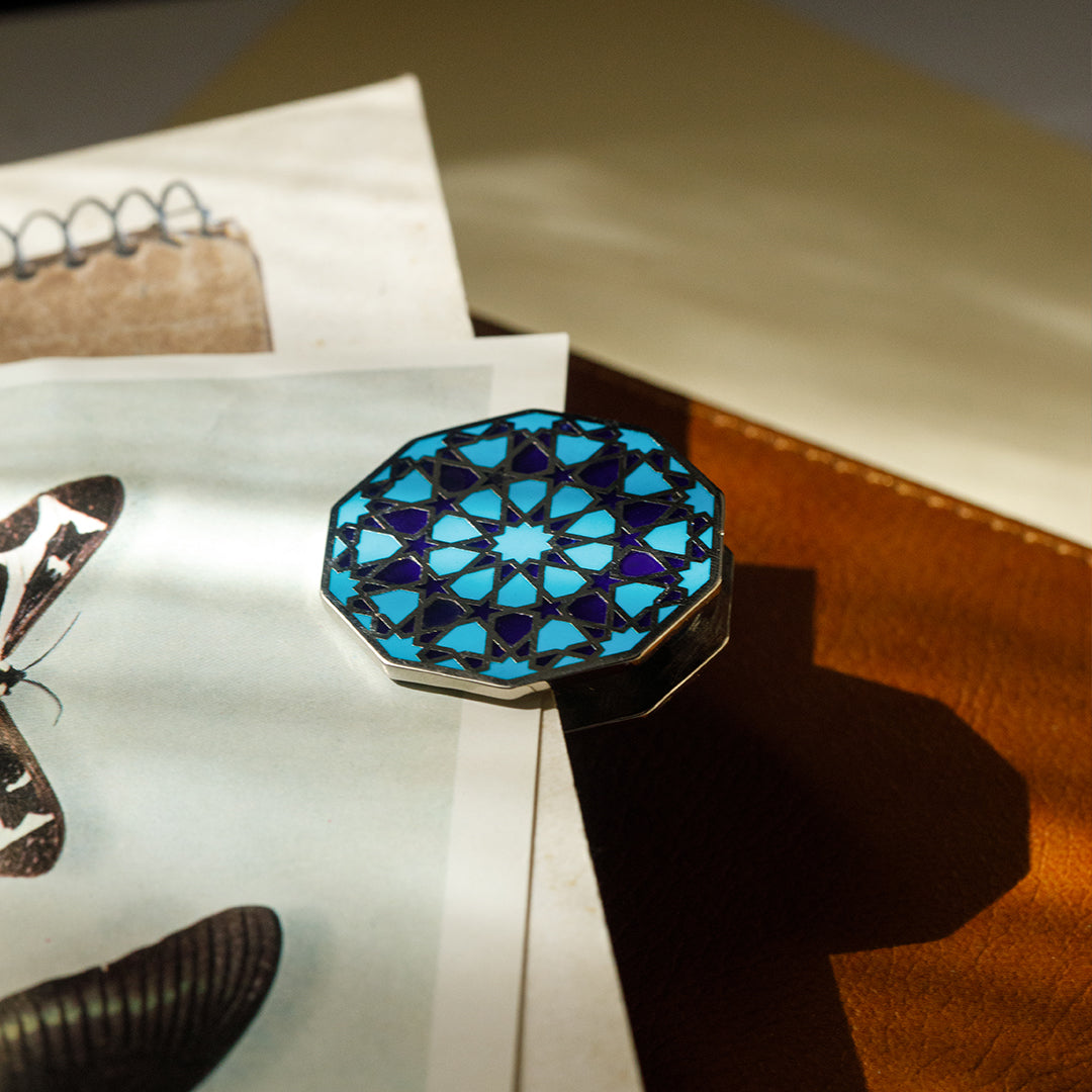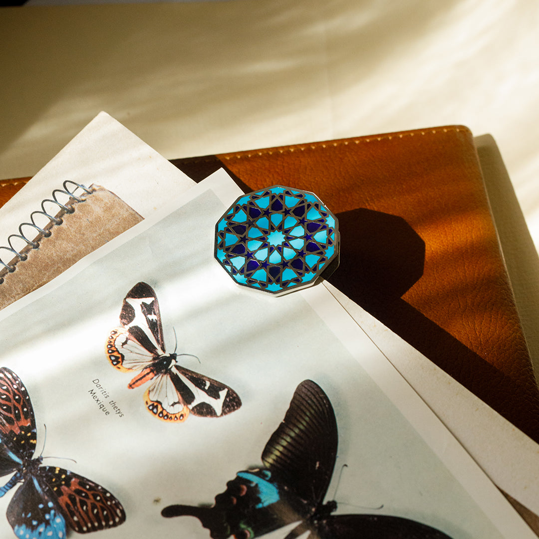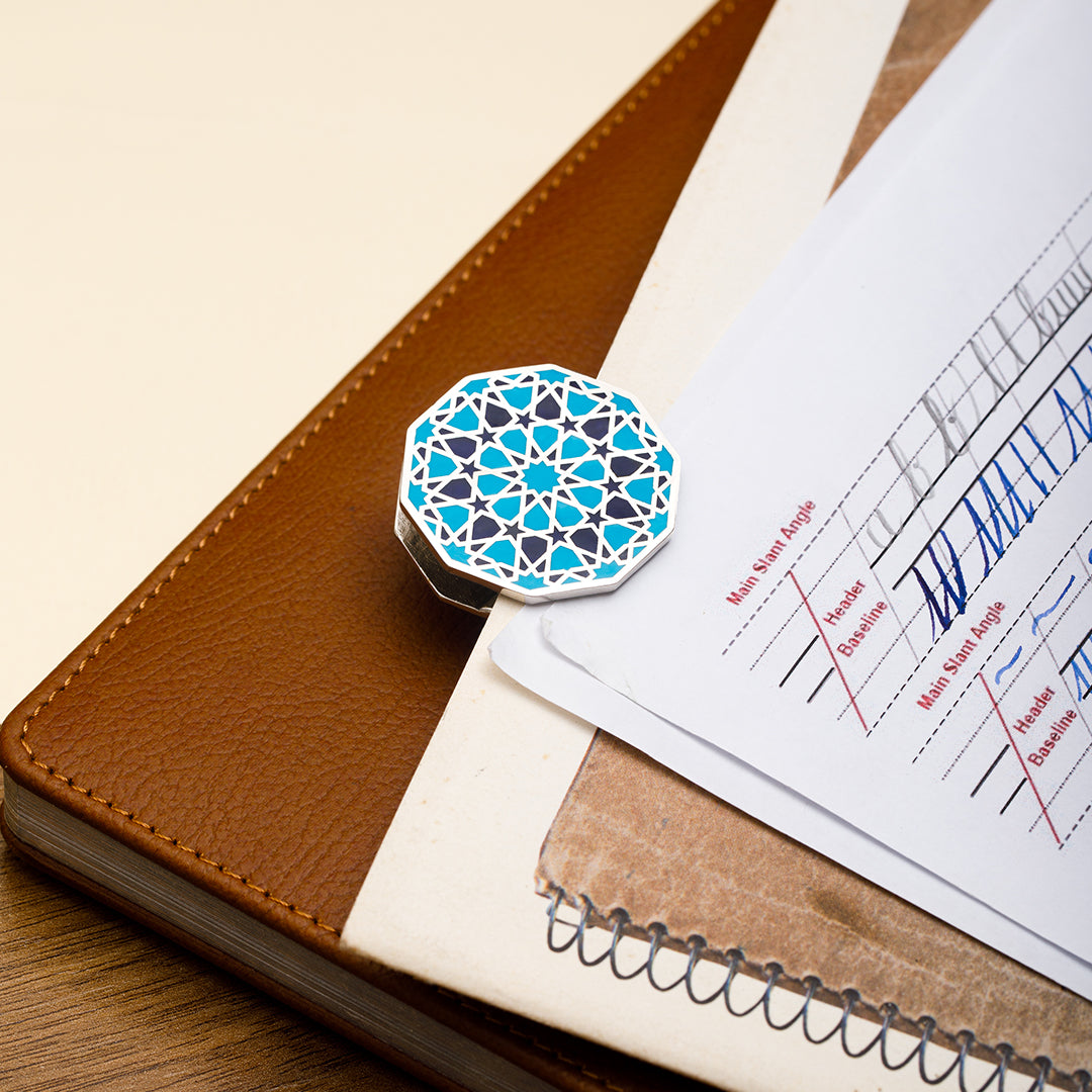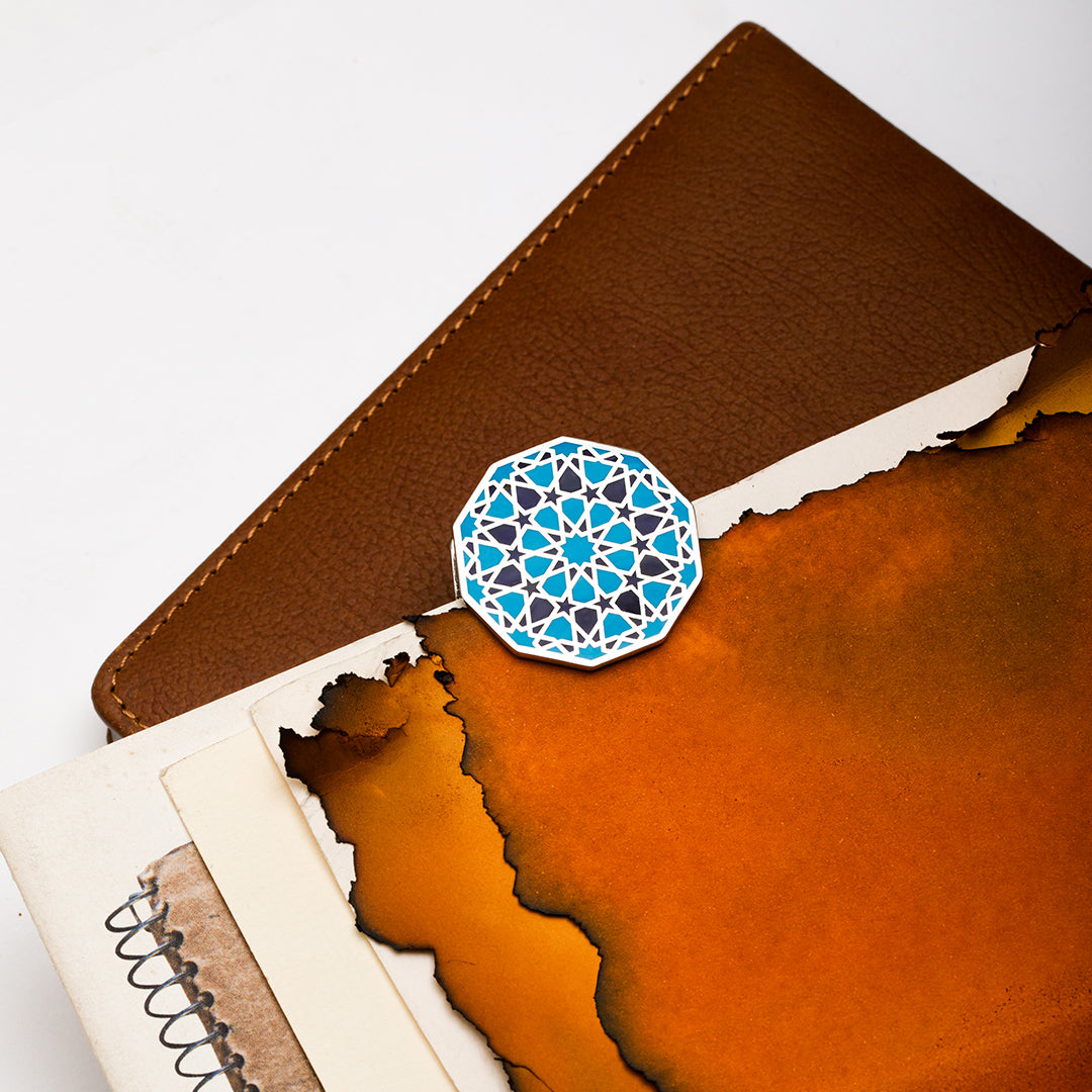 Ongen formdaki bu klips, kağıt tutucu; pirinç materyal üzerinde turkuaz lacivert minesi ve nikel kaplaması ile sadece işlevsel değil; aynı zamanda estetik bir duruşa da sahip. Selçuklu taş ve çini işçiliğinden ilham alan geometrik yapısı, her bakışta geçmişe bir selam niteliğinde. Özellikle ongen form, Selçuklu mimarisinde cennet tasvirinin simgesi olarak kullanılır; kubbelerde göğe açılan bir geçit gibi yer alır. Bu çokgen yapı, dünyevi olanla ilahi olanı buluşturur. Biz de bu formu, sözlerin, düşüncelerin ve tarihin bir araya gelip saklandığı bu küçük ama anlamlı objede yeniden yorumladık.