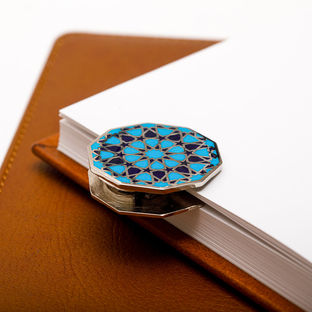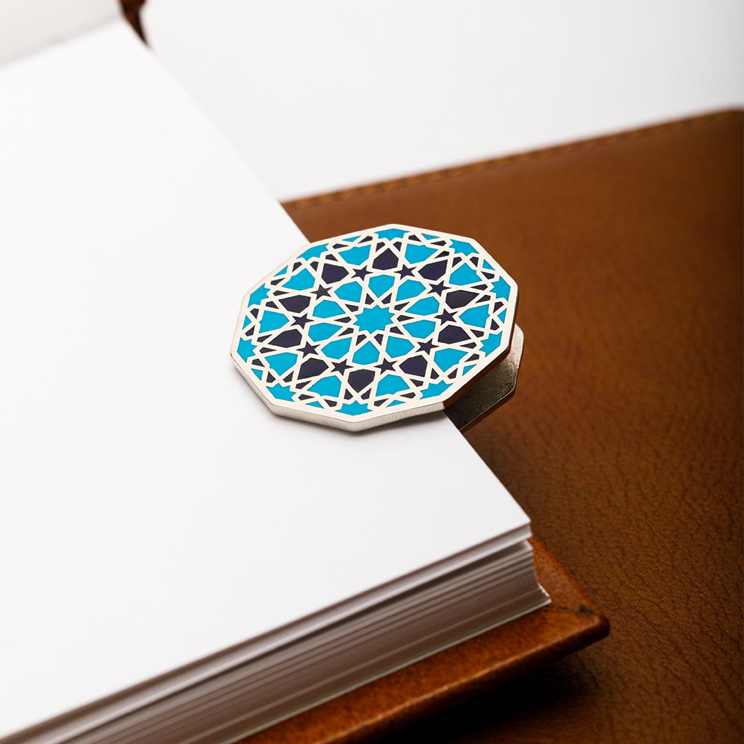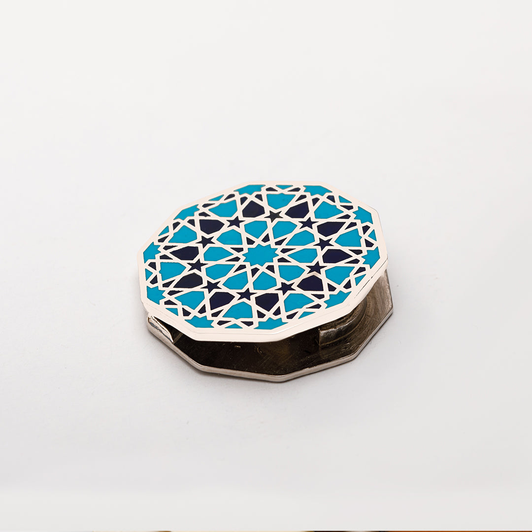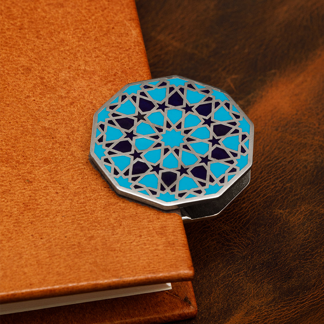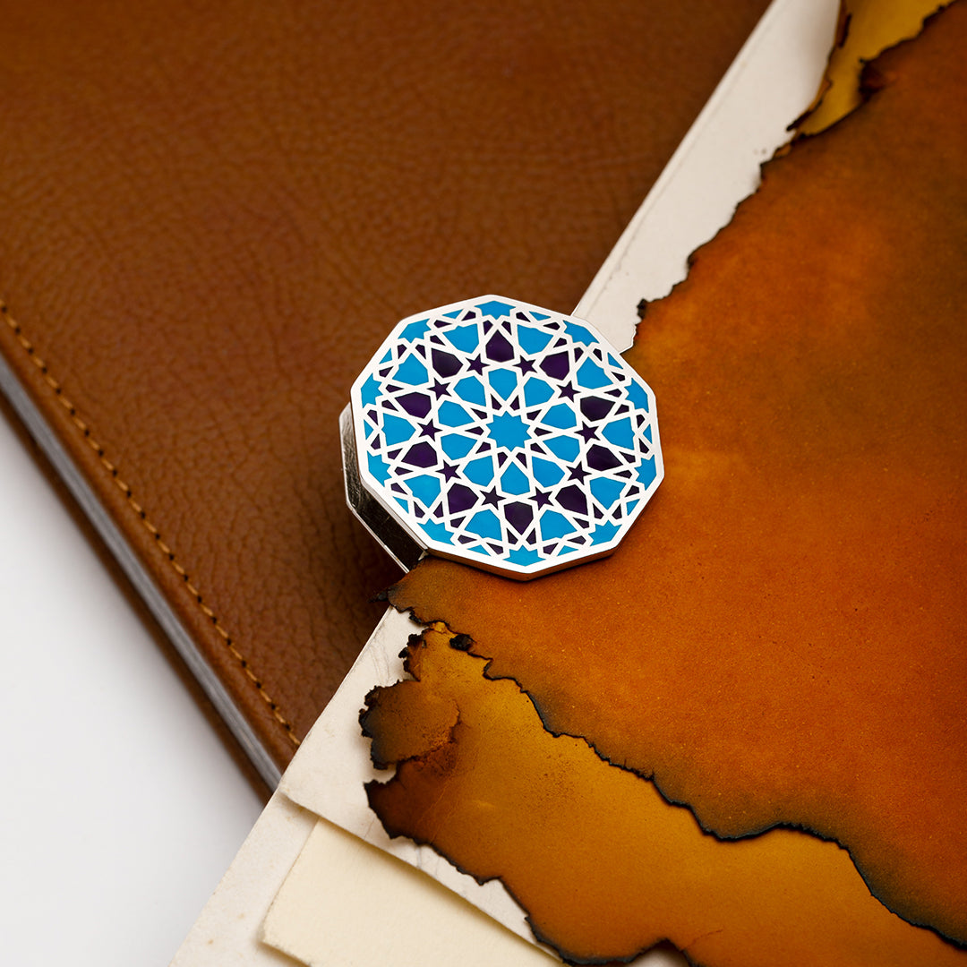 Ongen formdaki bu klips, kağıt tutucu; pirinç materyal üzerinde turkuaz lacivert minesi ve nikel kaplaması ile sadece işlevsel değil; aynı zamanda estetik bir duruşa da sahip. Selçuklu taş ve çini işçiliğinden ilham alan geometrik yapısı, her bakışta geçmişe bir selam niteliğinde. Özellikle ongen form, Selçuklu mimarisinde cennet tasvirinin simgesi olarak kullanılır; kubbelerde göğe açılan bir geçit gibi yer alır. Bu çokgen yapı, dünyevi olanla ilahi olanı buluşturur. Biz de bu formu, sözlerin, düşüncelerin ve tarihin bir araya gelip saklandığı bu küçük ama anlamlı objede yeniden yorumladık.