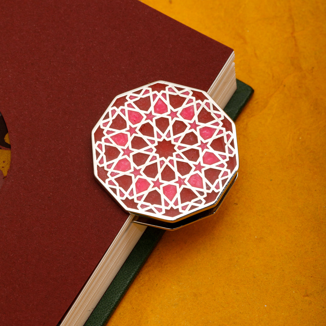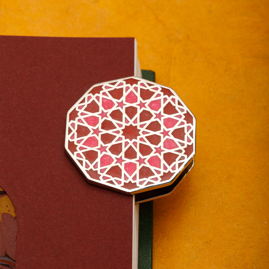 Ongen formdaki bu klips, kağıt tutucu; pirinç materyal üzerinde turuncu pembe minesi ve nikel kaplaması ile sadece işlevsel değil; aynı zamanda estetik bir duruşa da sahip. Selçuklu taş ve çini işçiliğinden ilham alan geometrik yapısı, her bakışta geçmişe bir selam niteliğinde. Özellikle ongen form, Selçuklu mimarisinde cennet tasvirinin simgesi olarak kullanılır; kubbelerde göğe açılan bir geçit gibi yer alır. Bu çokgen yapı, dünyevi olanla ilahi olanı buluşturur. Biz de bu formu, sözlerin, düşüncelerin ve tarihin bir araya gelip saklandığı bu küçük ama anlamlı objede yeniden yorumladık.