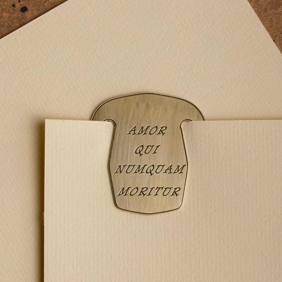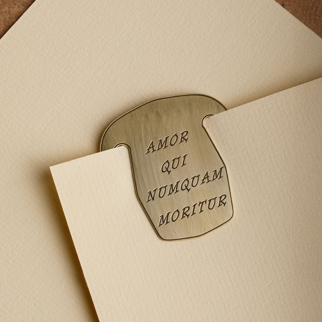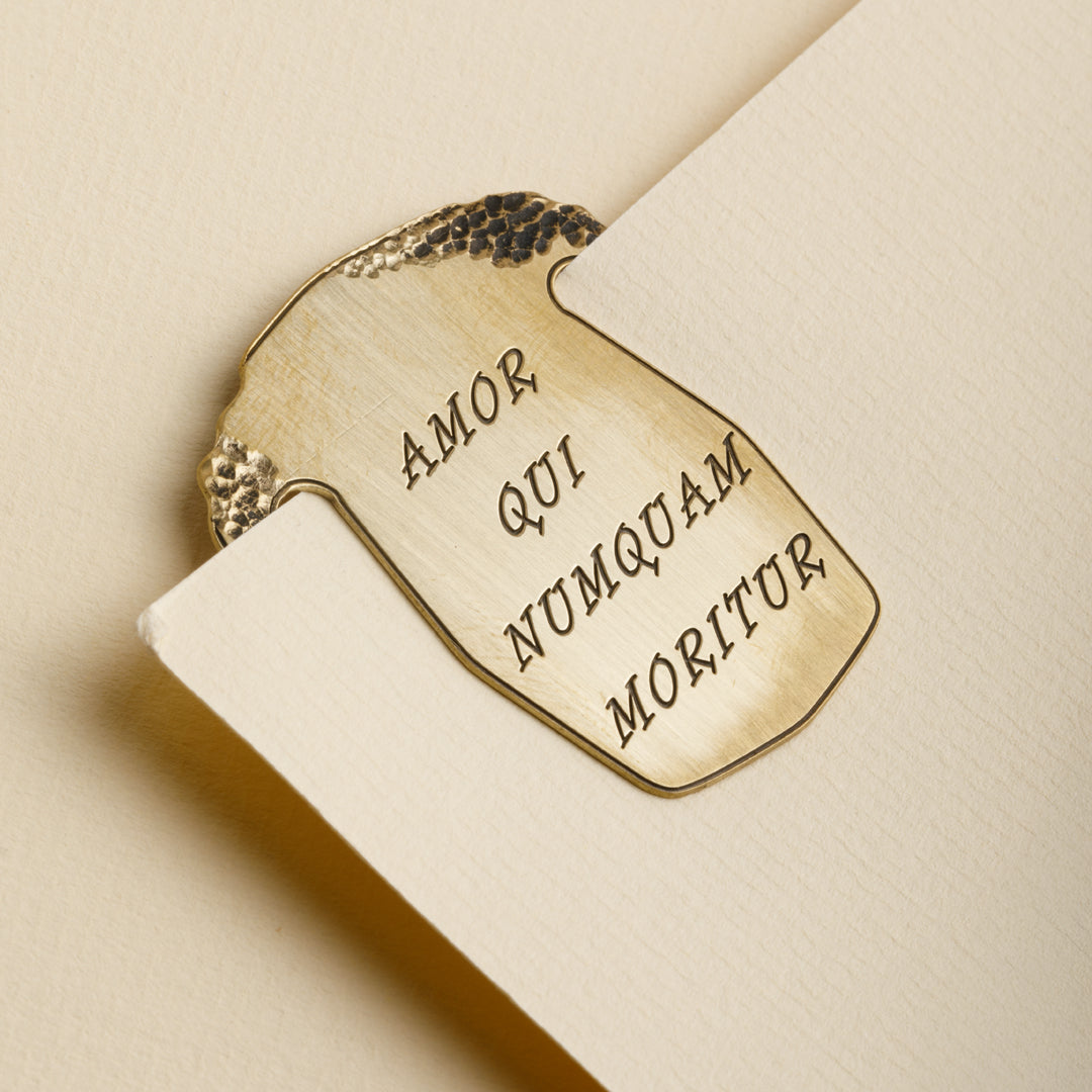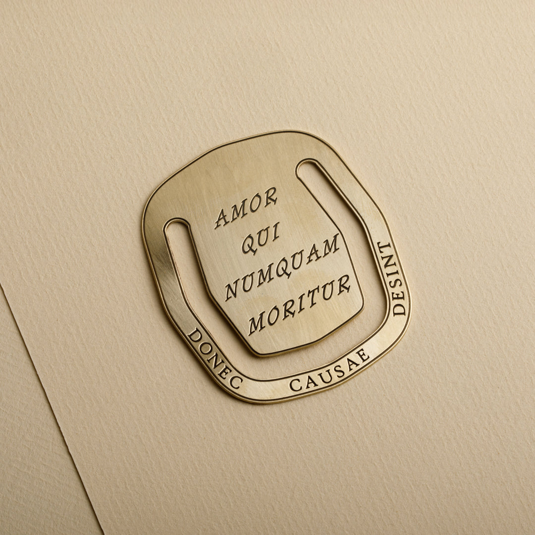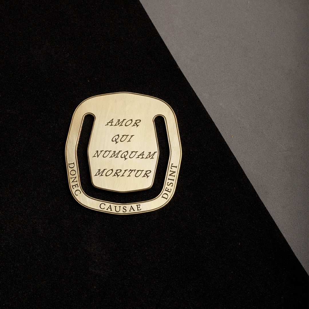 Bu özel ataç tasarımı dokulu ve düz olmak üzere iki farklı modelden oluşmaktadır. Ataç bölümünde “amor qui numquam moritur” (asla ölmeyen aşk) ifadesi yer alırken, çevresinde ise “donec causae desint” (bahaneler tükenene dek) yazısı bulunmaktadır. Arka kısmı ise kişiselleştirilebilir alan olarak tasarlanmıştır. Bu alana en fazla 30 harften oluşan size özel bir yazı eklenebilir.