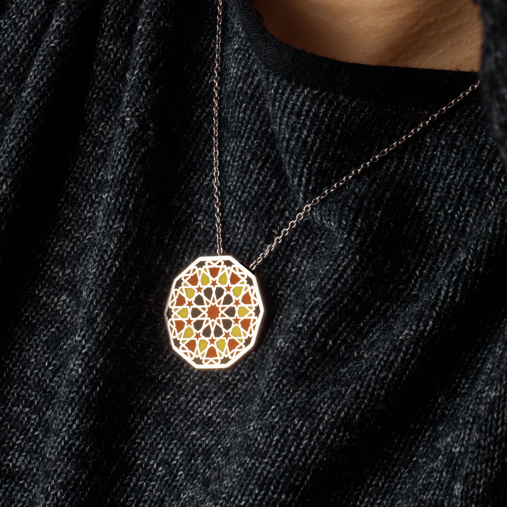 Selçuklu ve Osmanlı devletlerine ait olan geometrik süsleme sanatından bazı örnekler kullanılmıştır. Sonsuzluk ilkesine dayanan desen çalışmaları gümüş üzerine tek tek her boşluğa mine yapılarak uygulanmıştır.