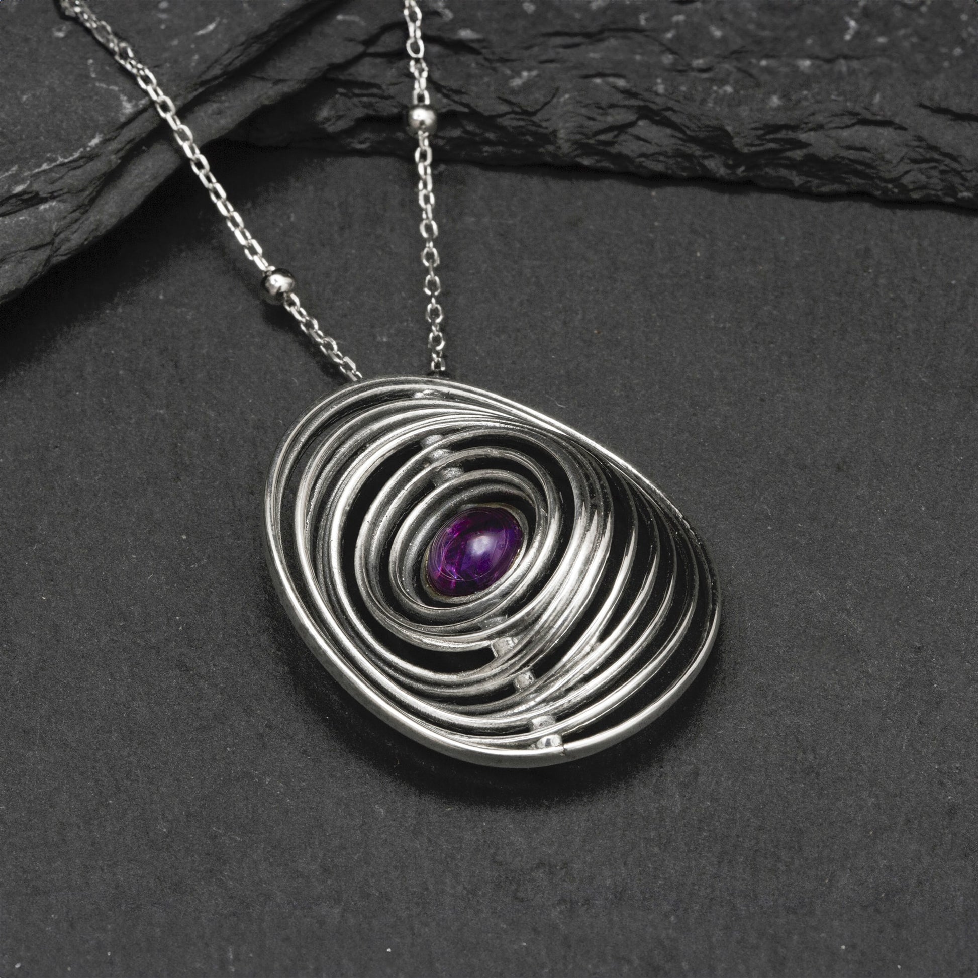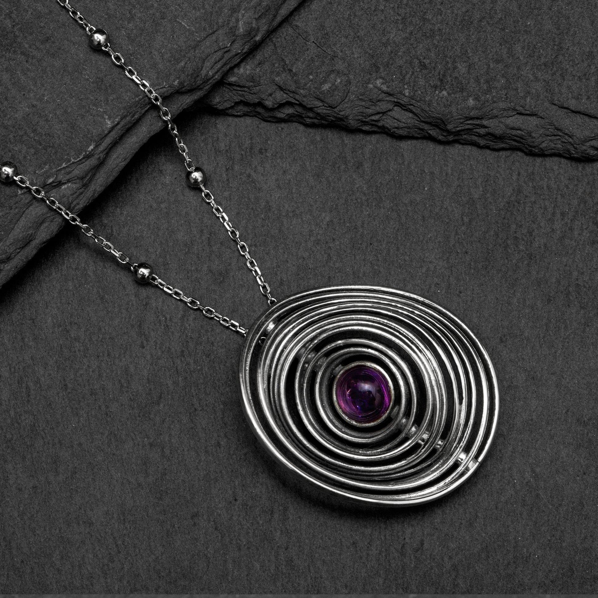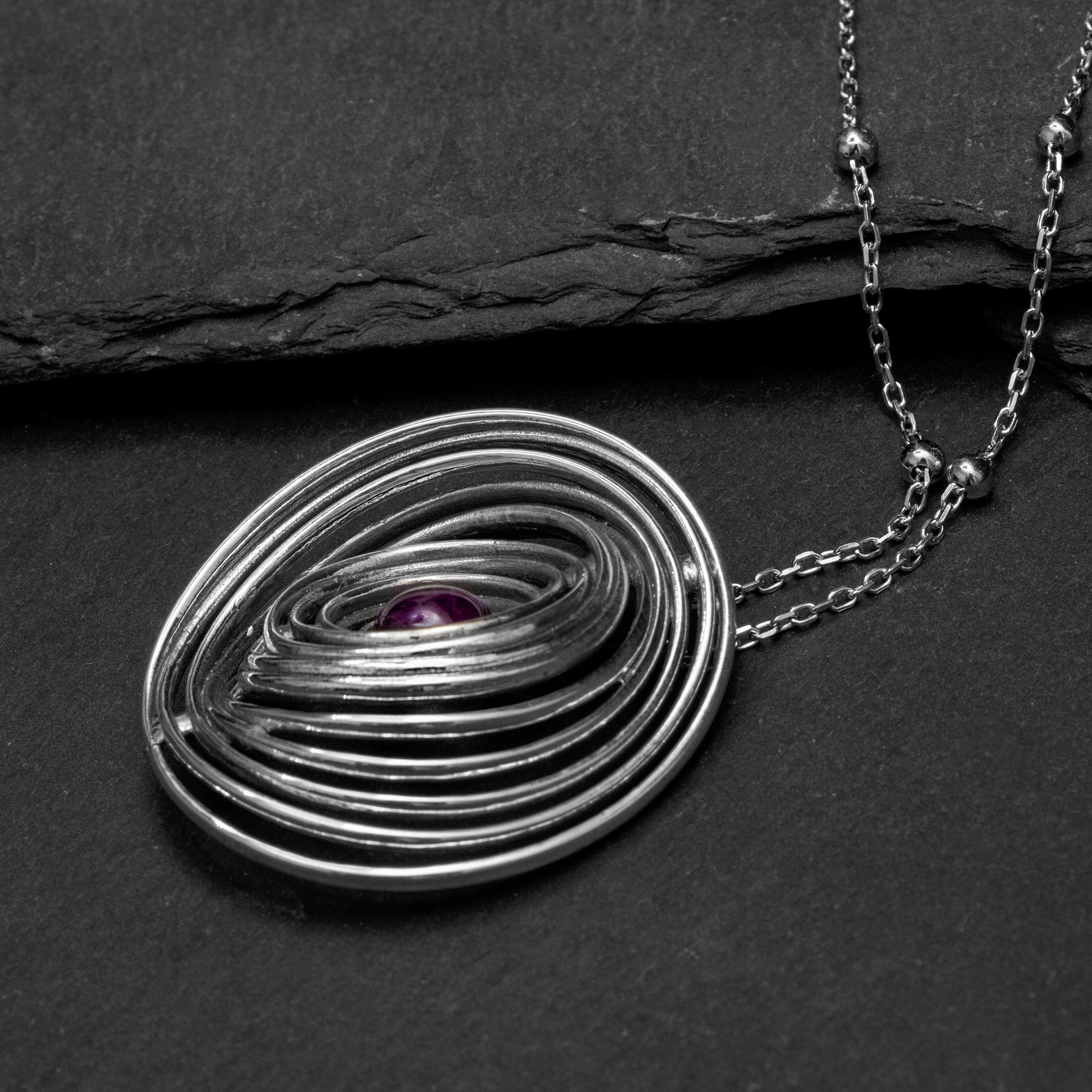 Bu tasarım, insanlığın merak duygusunun ve keşfetme arzusunun şekillendirdiği bir metafor sunuyor. Bir yanda kara deliğin çekim alanını ve evrenin derinliklerindeki gizemleri simgeleyen detaylar yer alırken diğer yanda zamanın akışını ve hareketin başlangıcını temsil eden dinamizm yer alıyor. Kolye insanın iç ve dış yolculuğunu anlatırken, ortada bulunan taş ise evrensel bir bağı ifade ederek hem insanlığın evrendeki keşif yolculuğunu hem de kendi iç yolculuğunu yansıtıyor.