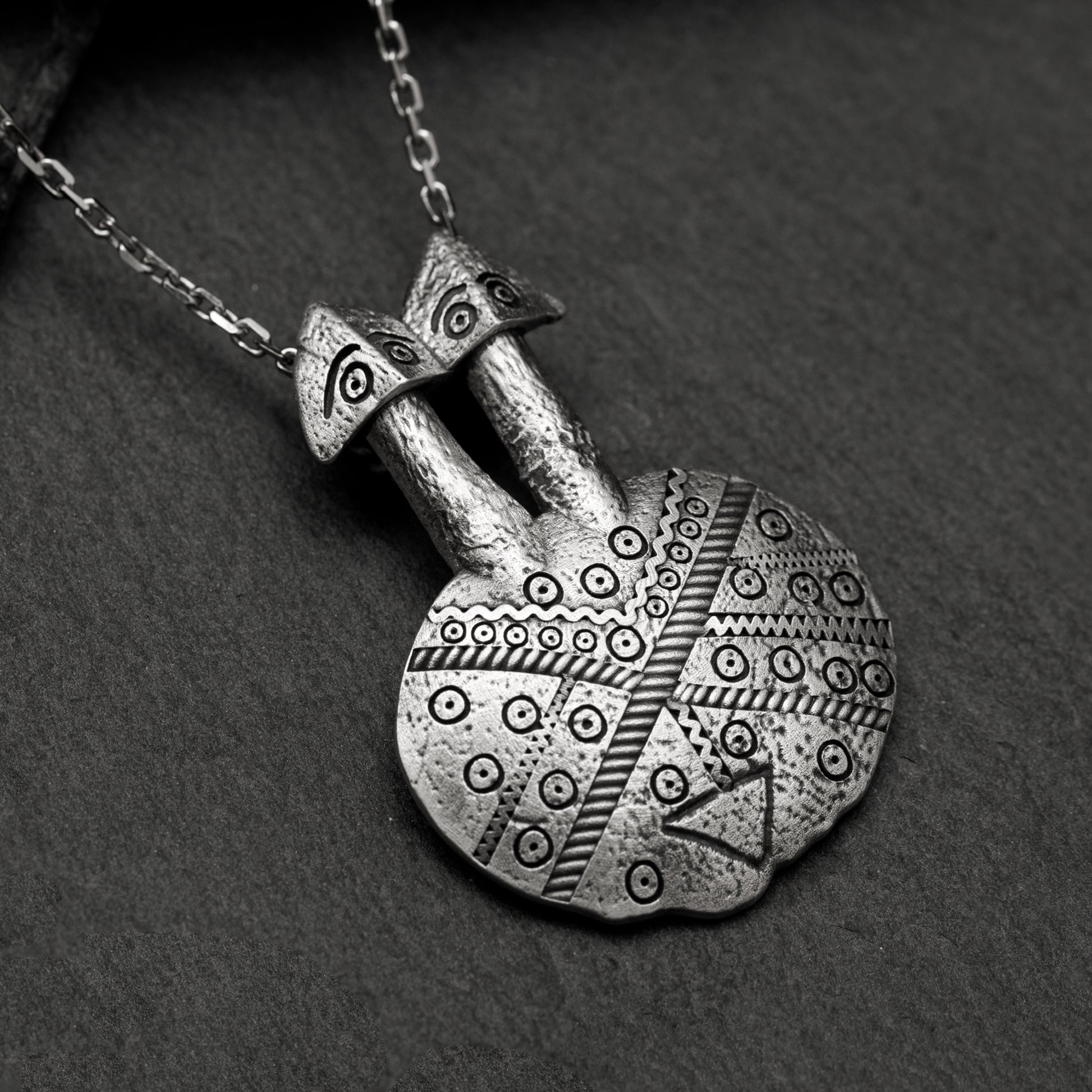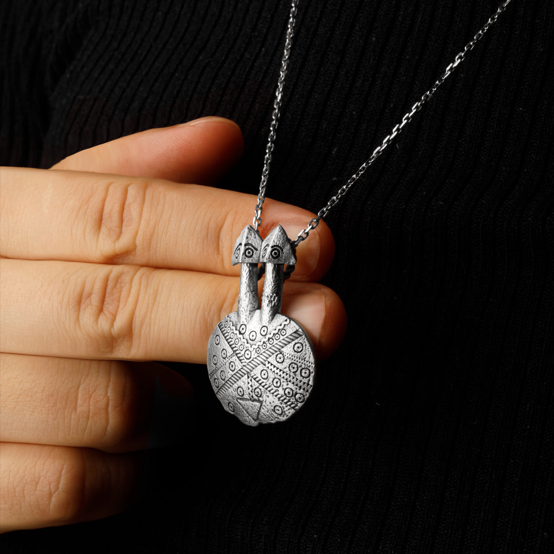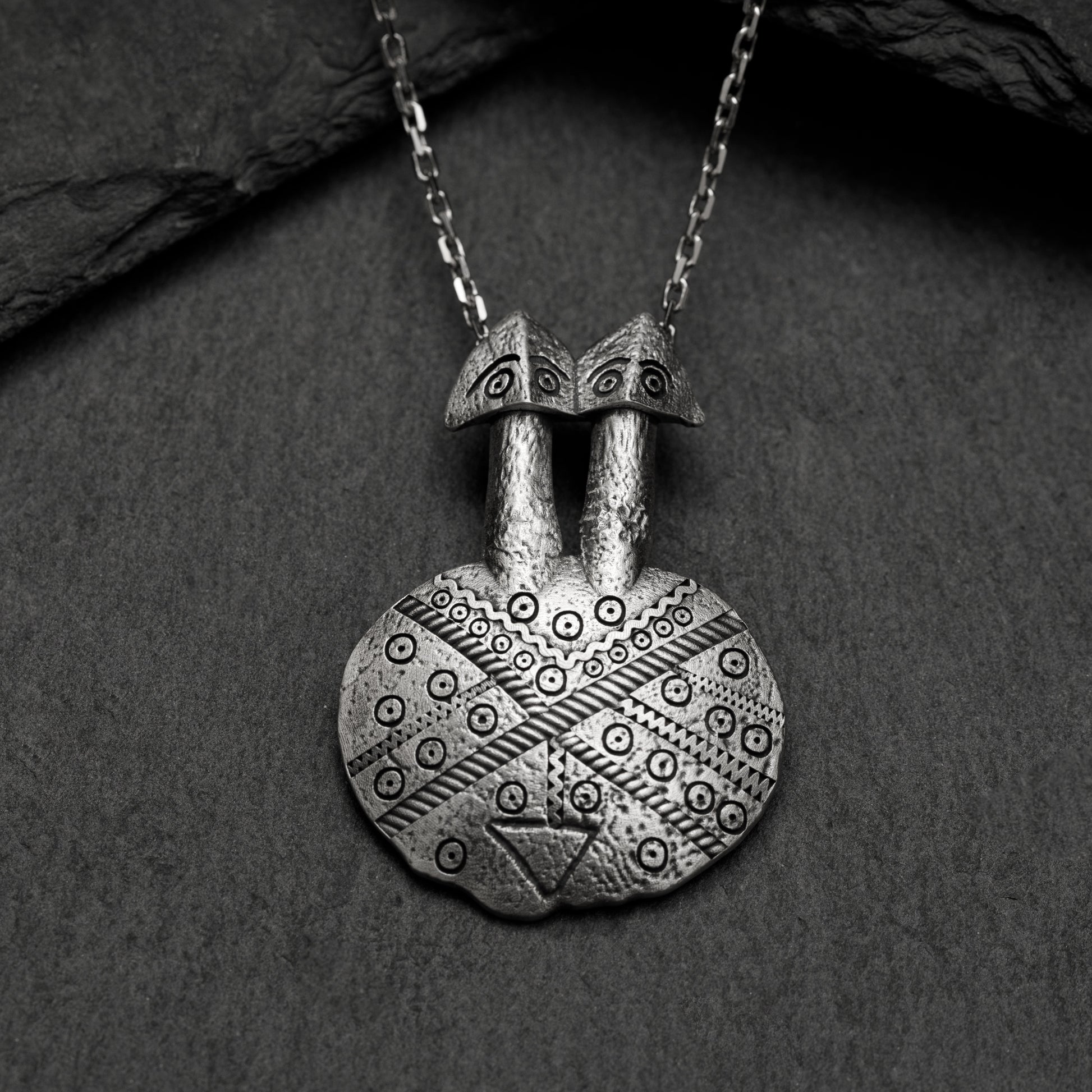 İkiz İdol Kolye, tarih öncesi Anadolu uygarlıklarının mistik ve simgesel dünyasından ilham alarak tasarlandı. Çift başlı figürüyle, birlikteliği, dengeyi ve koruyucu gücü simgeler. Geleneksel motiflerle işlenmiş yüzeyi, kadim sembollerle bezenmiş olup, geçmişten günümüze uzanan bir hikâye anlatır. El işçiliğiyle üretilen bu özel tasarım, modern takı anlayışıyla tarihî dokuyu bir araya getiriyor.