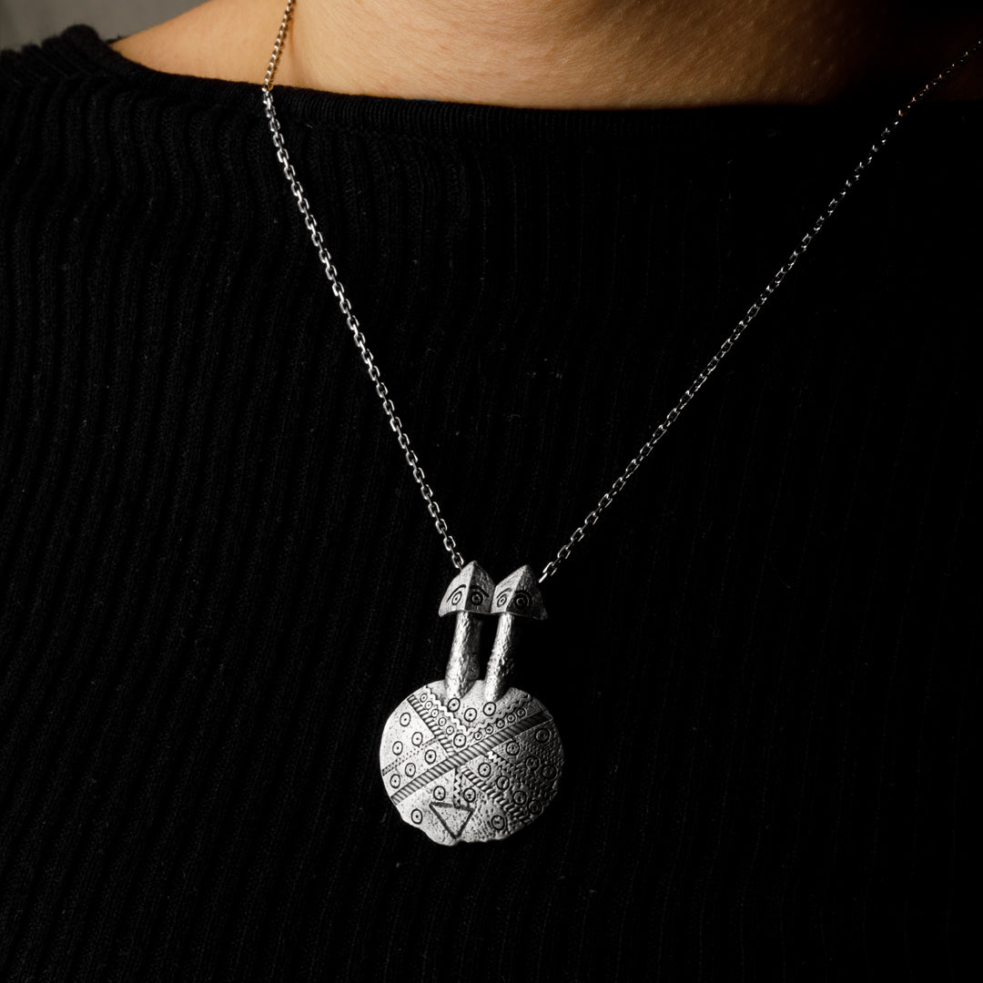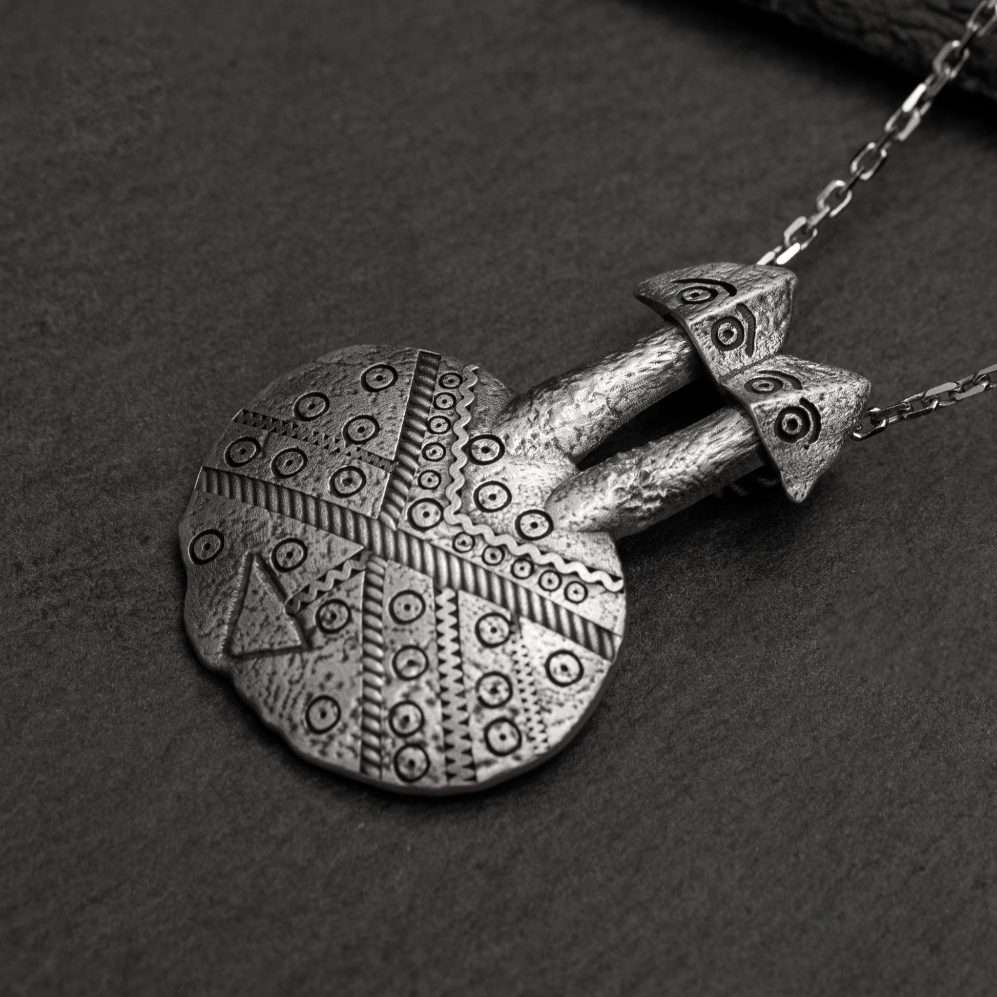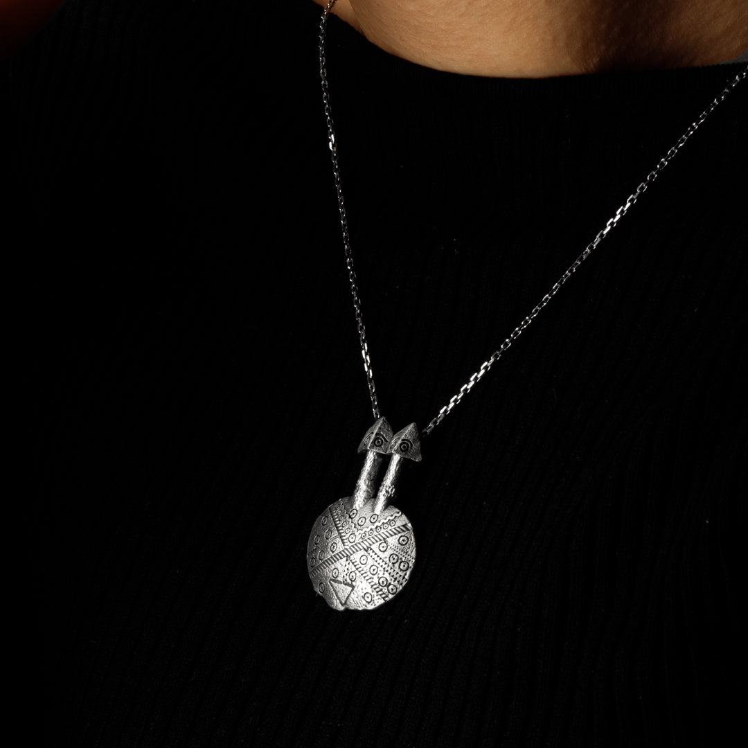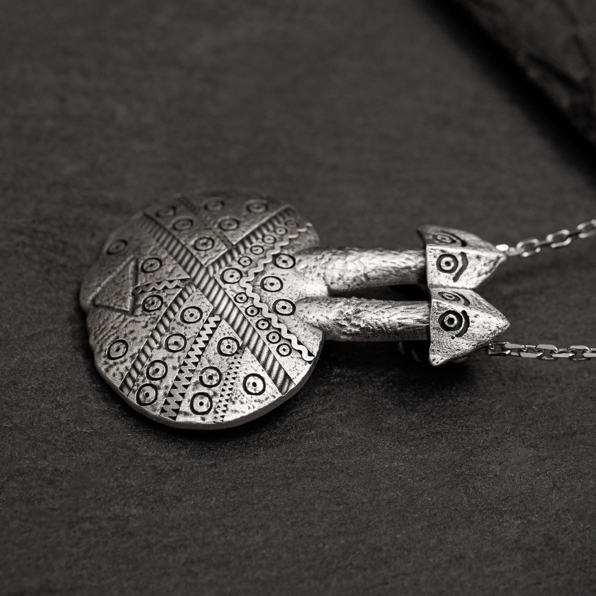 İkiz İdol Kolye, tarih öncesi Anadolu uygarlıklarının mistik ve simgesel dünyasından ilham alarak tasarlandı. Çift başlı figürüyle, birlikteliği, dengeyi ve koruyucu gücü simgeler. Geleneksel motiflerle işlenmiş yüzeyi, kadim sembollerle bezenmiş olup, geçmişten günümüze uzanan bir hikâye anlatır. El işçiliğiyle üretilen bu özel tasarım, modern takı anlayışıyla tarihî dokuyu bir araya getiriyor.