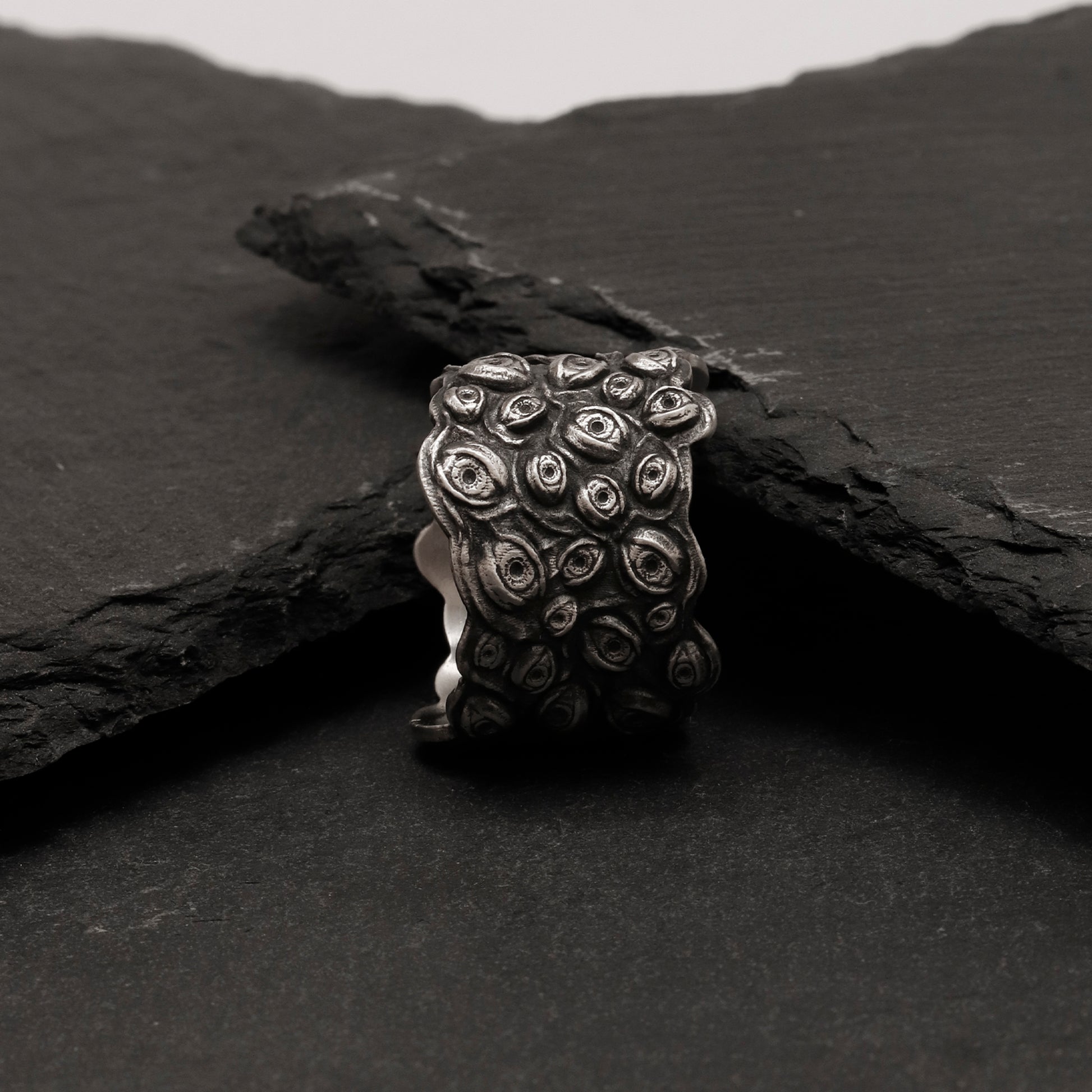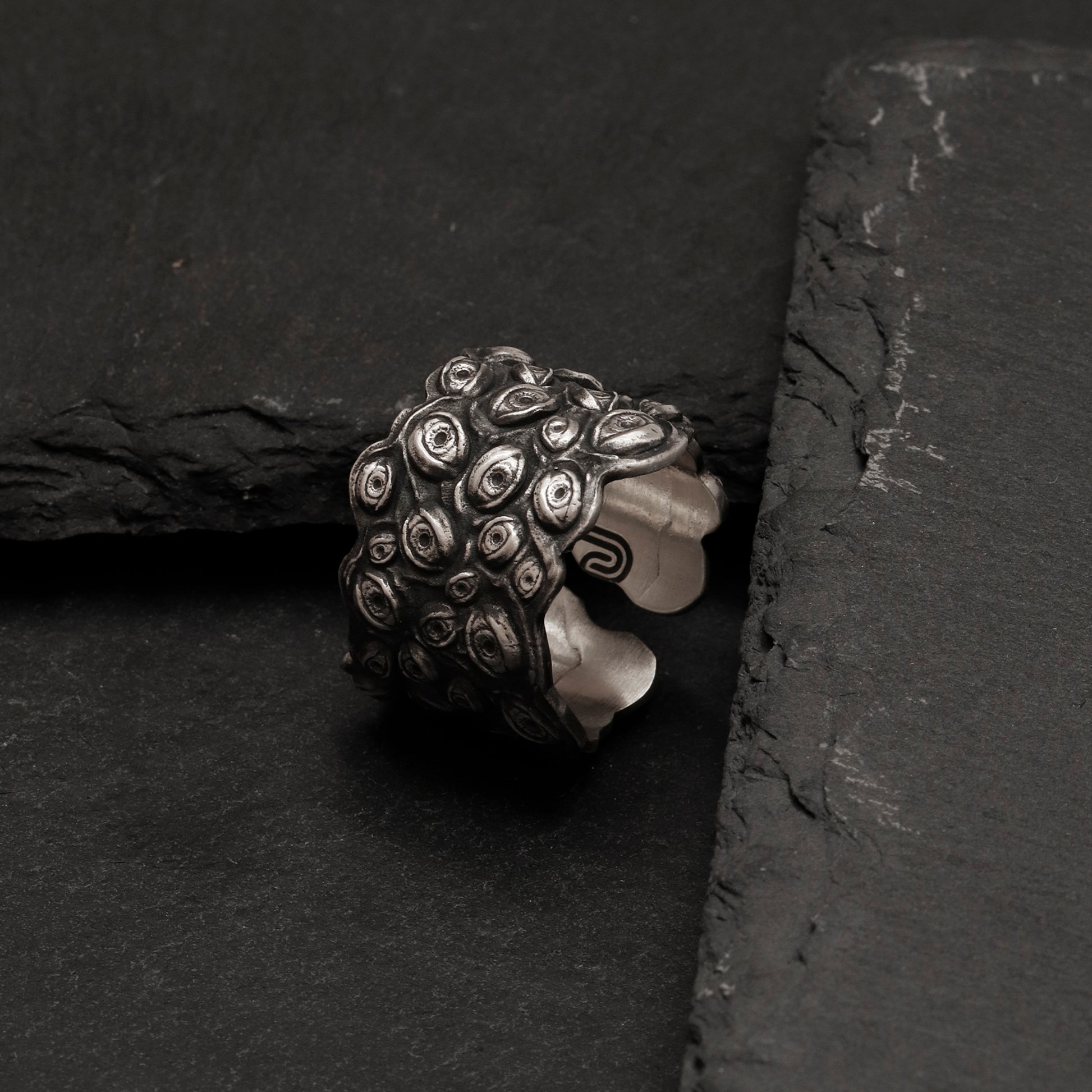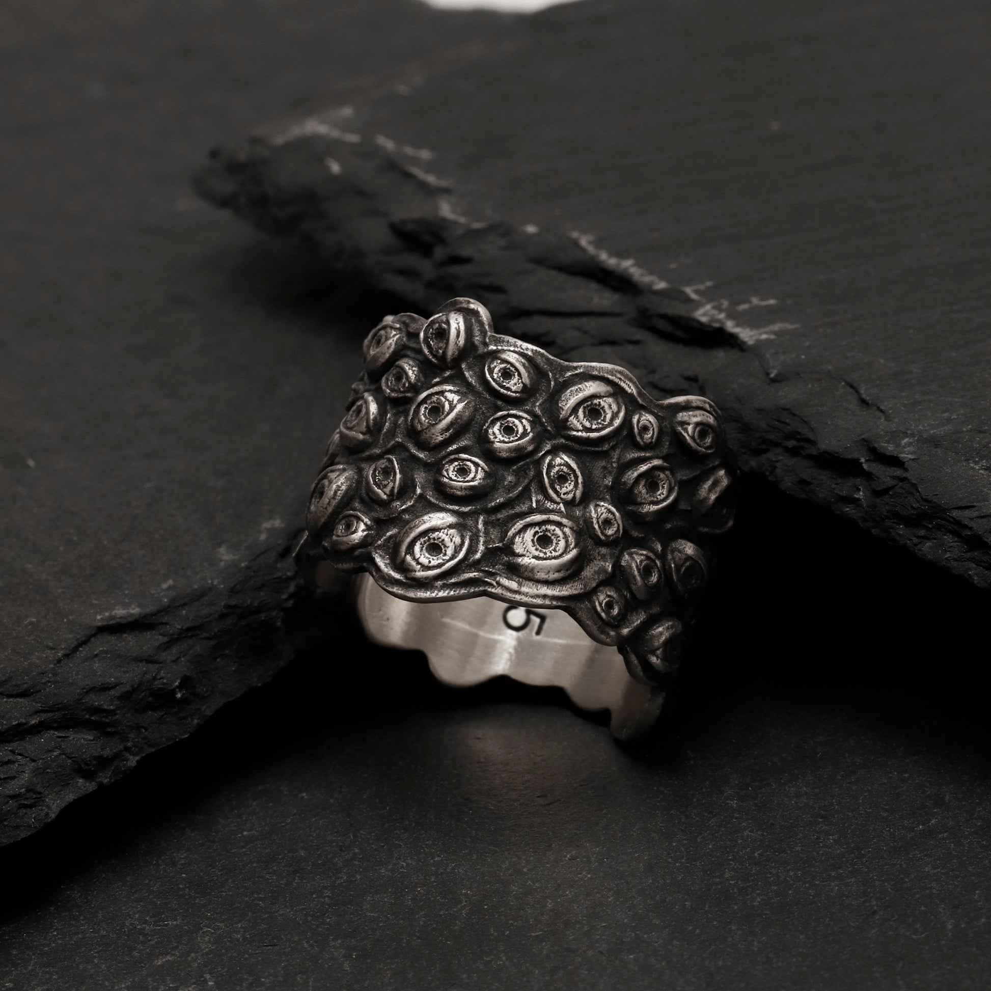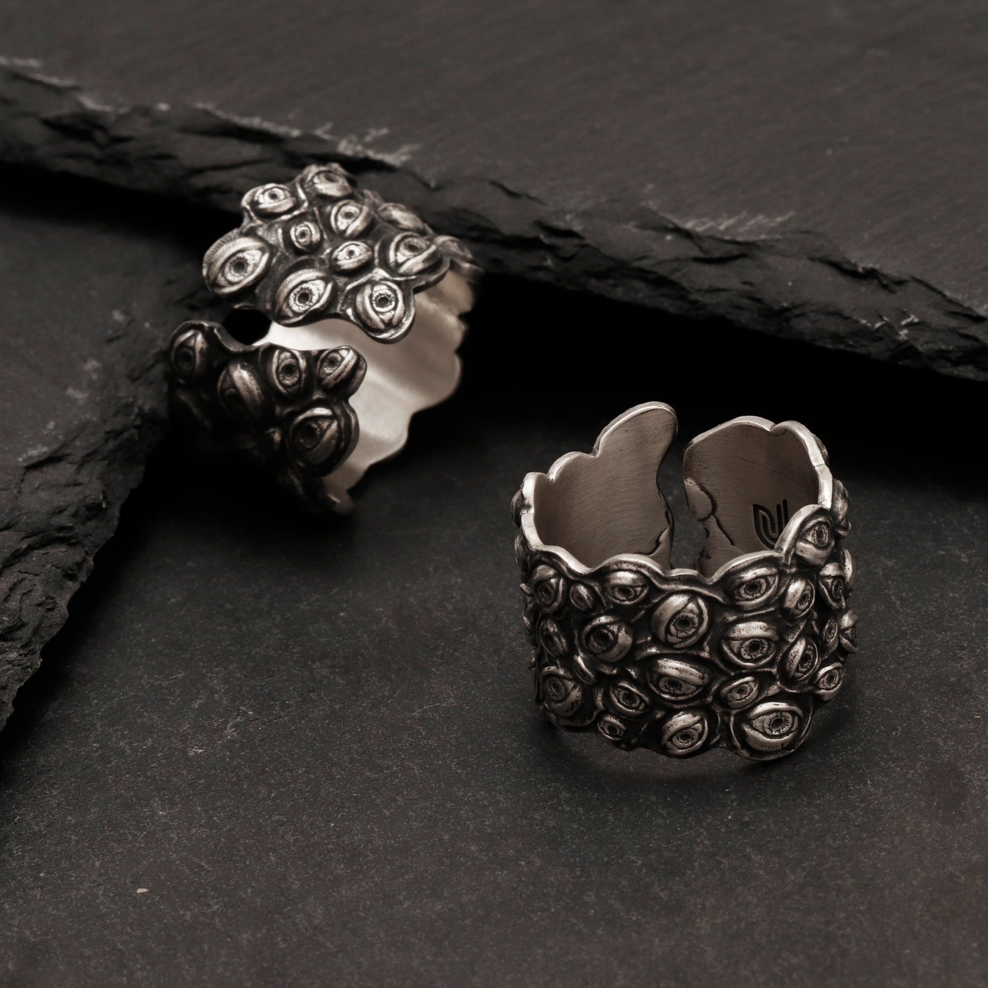 Amorf bir form oluşturup, çeşitli boy ve yönlerde gözlerle kurguladık. Estetiği tasarıma dahil ettik. Yüzüğü her iki yönde de takabilirsiniz. Yüzüğün bağlantı kısmı ayarlanabilir. Bu kısım kullanılabilecek şekilde tasarlanmıştır.