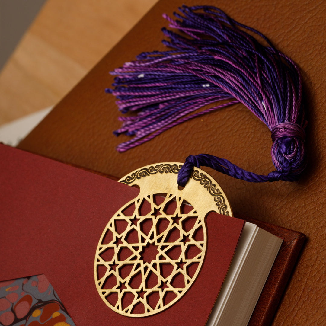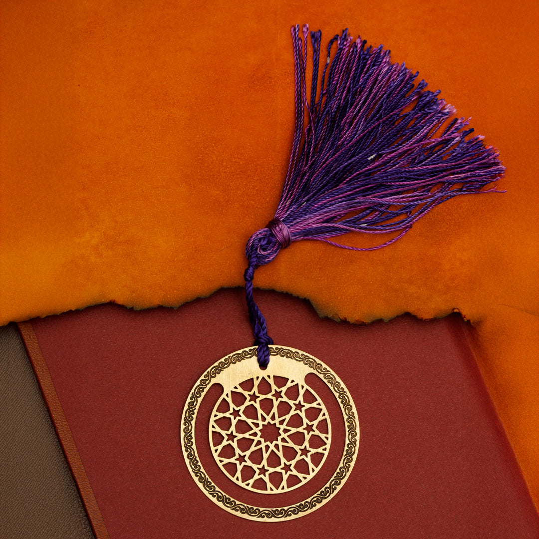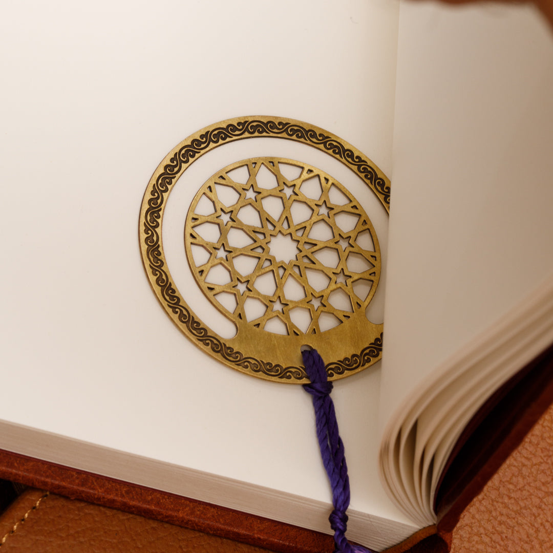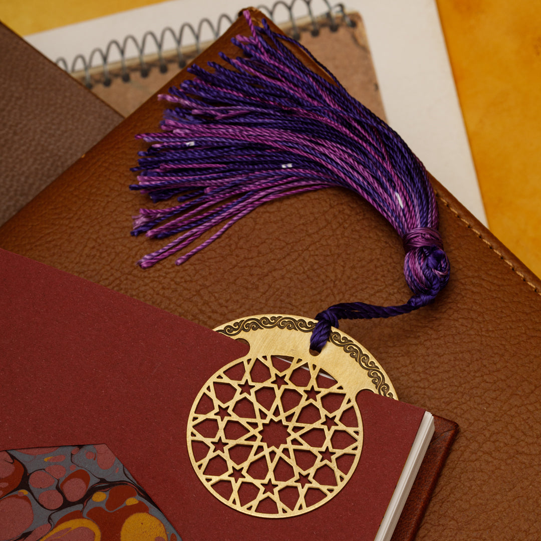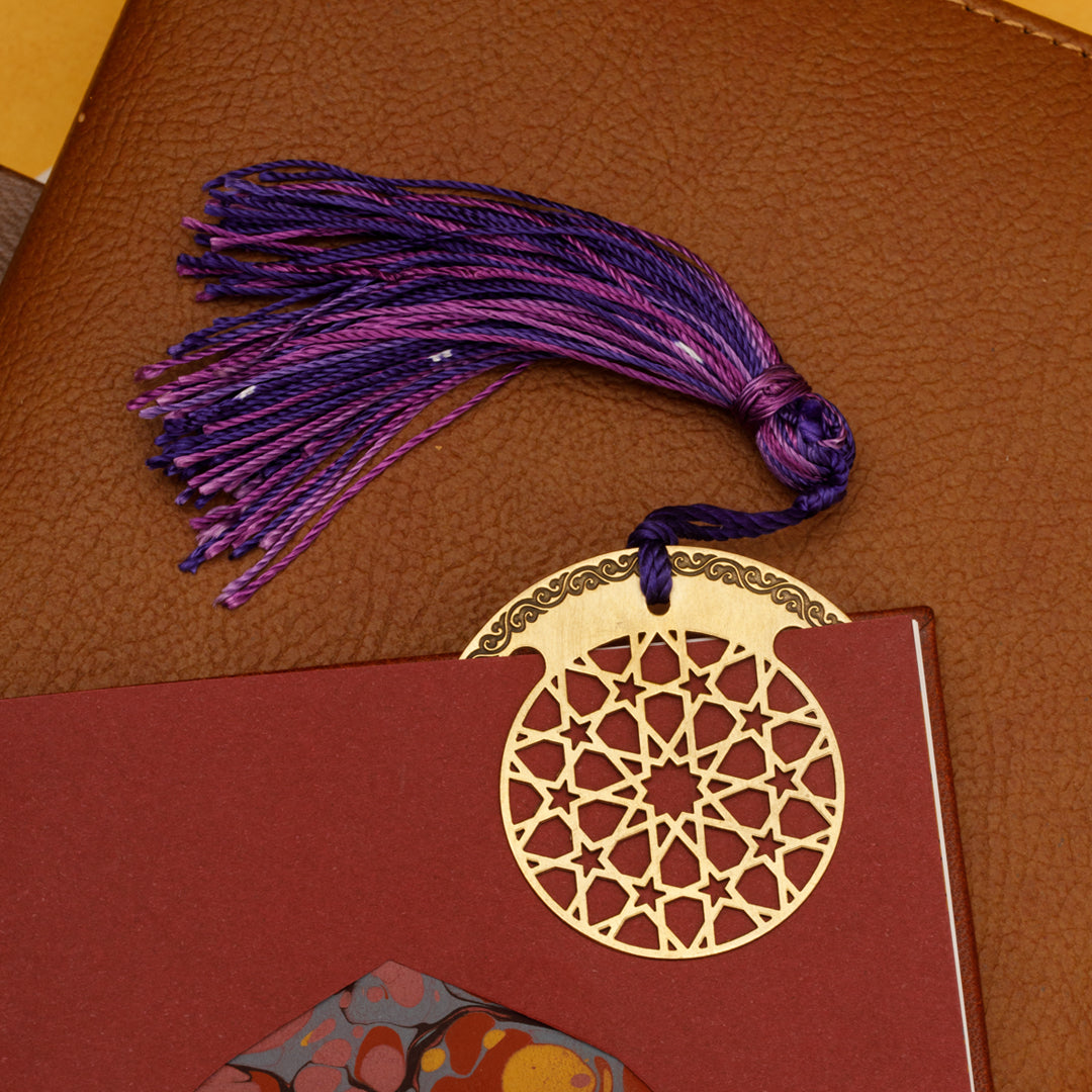 Bu özel ayraç, Selçuklu döneminden ilham alan geometrik desenlerle şekillendirilmiş olup, dış çerçevesinde ince bitkisel süslemelerle zenginleştirilmiştir. Pirinç malzeme eskitme doku ile bitirilmiş olup, tasarım estetik bir püskül detayıyla tamamlanmıştır. Sadece bir ayraç değil; aynı zamanda şık bir broş olarak da kullanılabilecek çok yönlü bir parçadır.
