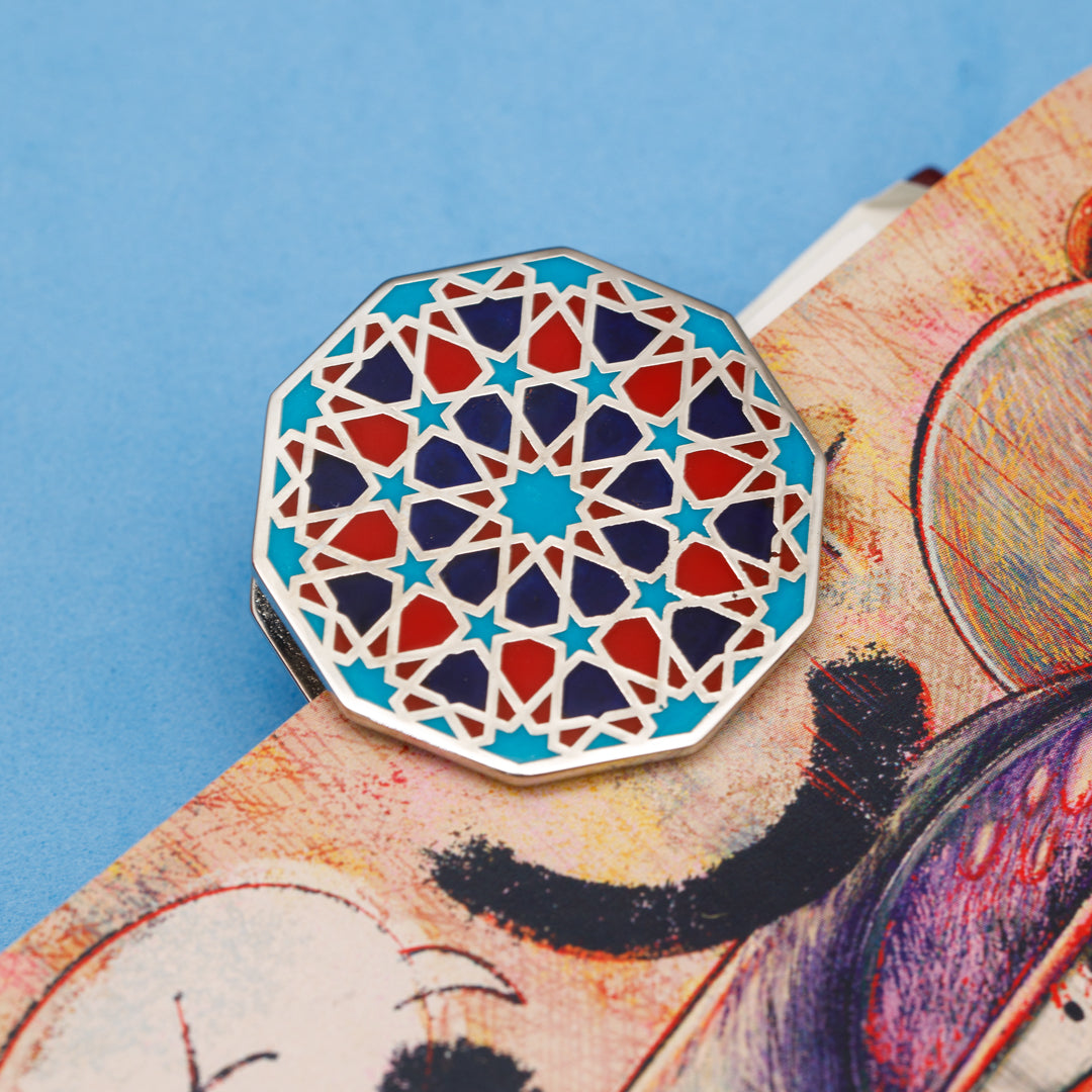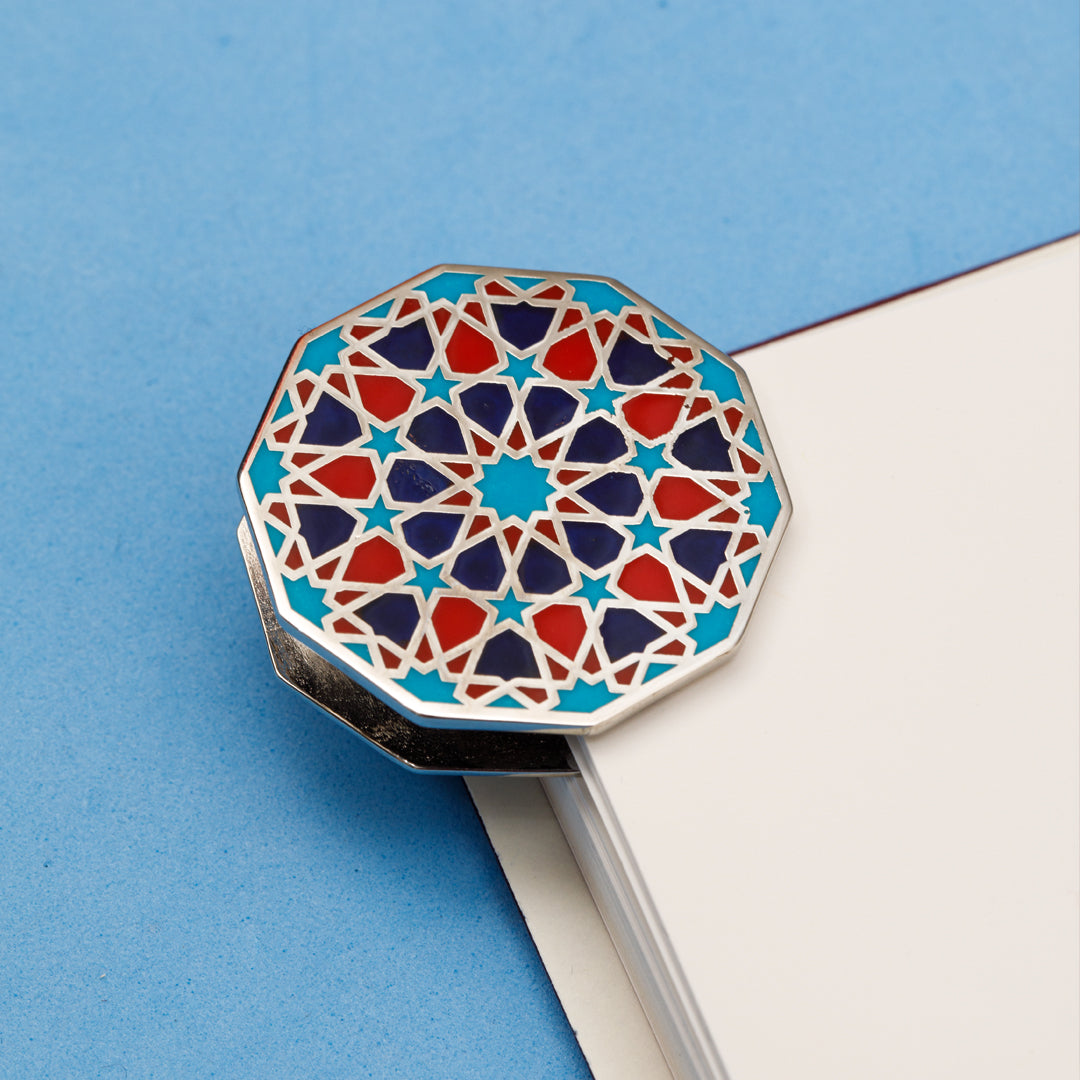 Ongen formdaki bu klips, kağıt tutucu; pirinç materyal üzerinde yeşil minesi ve nikel kaplaması ile sadece işlevsel değil; aynı zamanda estetik bir duruşa da sahip. Selçuklu taş ve çini işçiliğinden ilham alan geometrik yapısı, her bakışta geçmişe bir selam niteliğinde. Özellikle ongen form, Selçuklu mimarisinde cennet tasvirinin simgesi olarak kullanılır; kubbelerde göğe açılan bir geçit gibi yer alır. Bu çokgen yapı, dünyevi olanla ilahi olanı buluşturur. Biz de bu formu, sözlerin, düşüncelerin ve tarihin bir araya gelip saklandığı bu küçük ama anlamlı objede yeniden yorumladık.