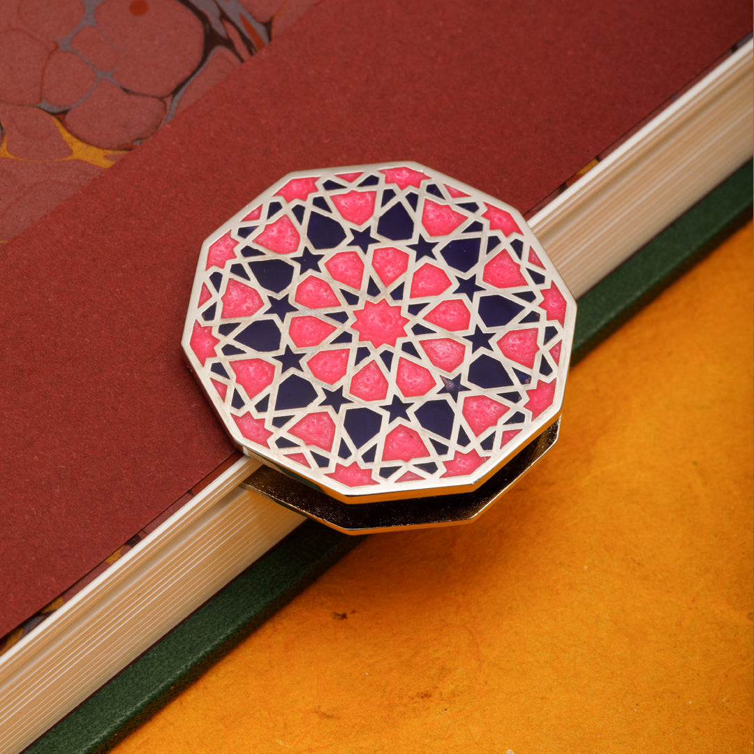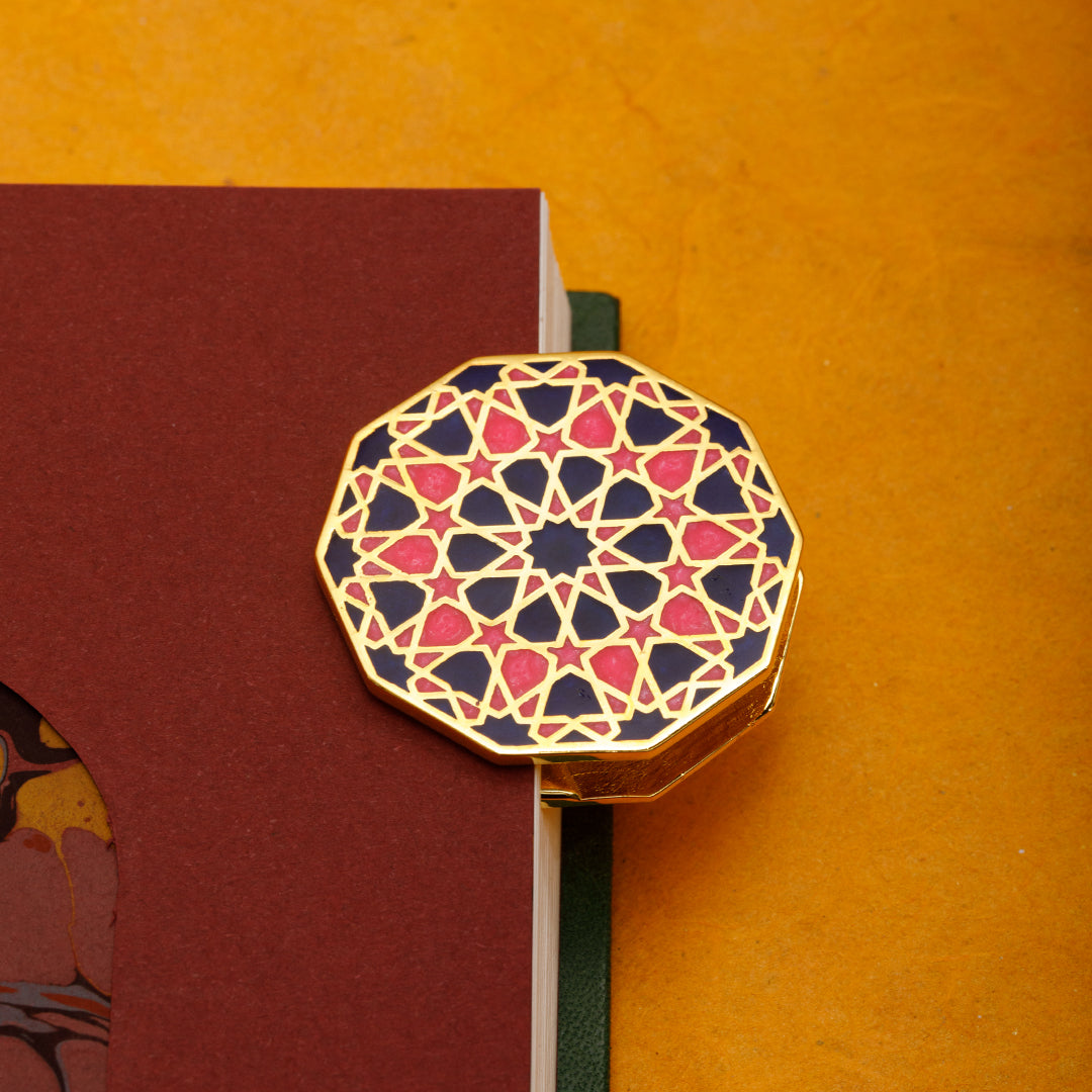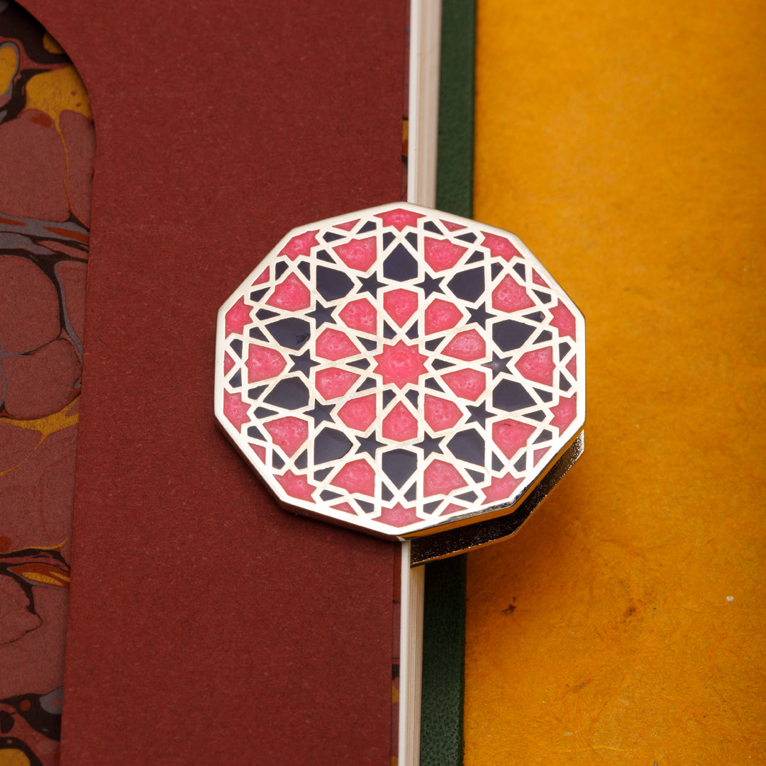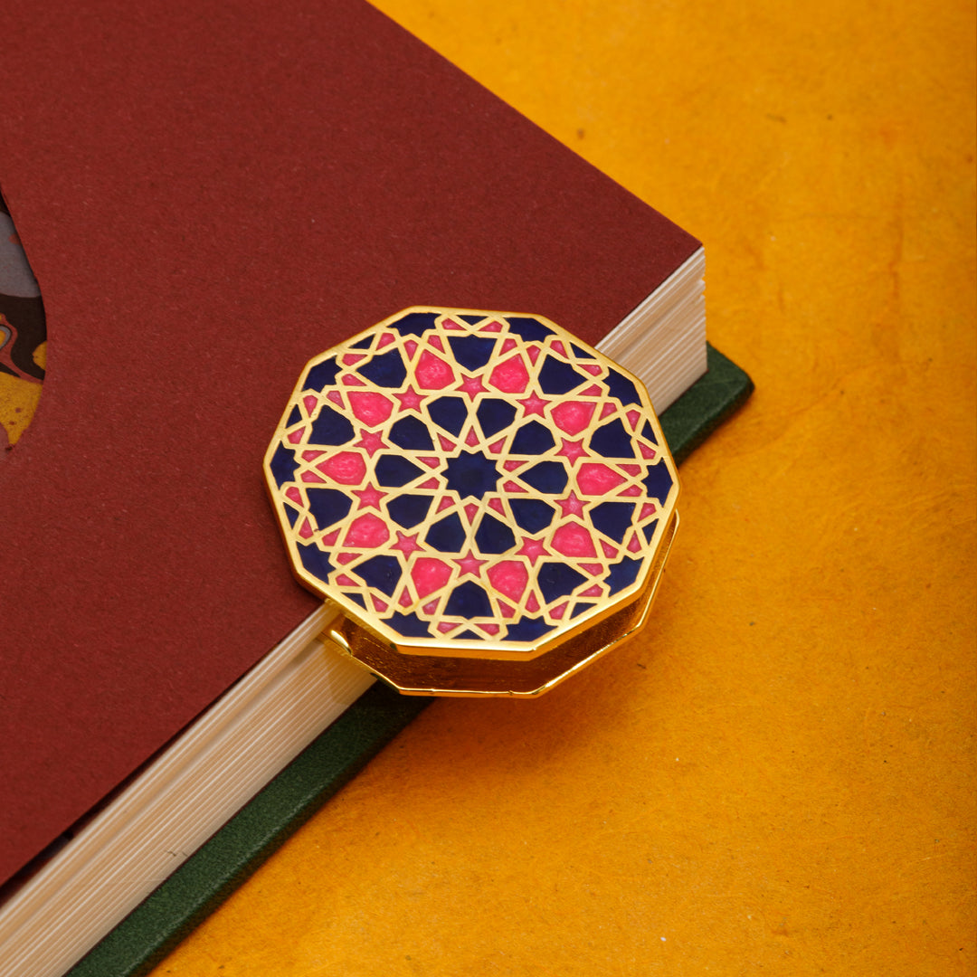 Ongen formdaki bu klips, kağıt tutucu; pirinç materyal üzerinde pembe lacivert minesi ve nikel kaplaması ile sadece işlevsel değil; aynı zamanda estetik bir duruşa da sahip. Selçuklu taş ve çini işçiliğinden ilham alan geometrik yapısı, her bakışta geçmişe bir selam niteliğinde. Özellikle ongen form, Selçuklu mimarisinde cennet tasvirinin simgesi olarak kullanılır; kubbelerde göğe açılan bir geçit gibi yer alır. Bu çokgen yapı, dünyevi olanla ilahi olanı buluşturur. Biz de bu formu, sözlerin, düşüncelerin ve tarihin bir araya gelip saklandığı bu küçük ama anlamlı objede yeniden yorumladık.