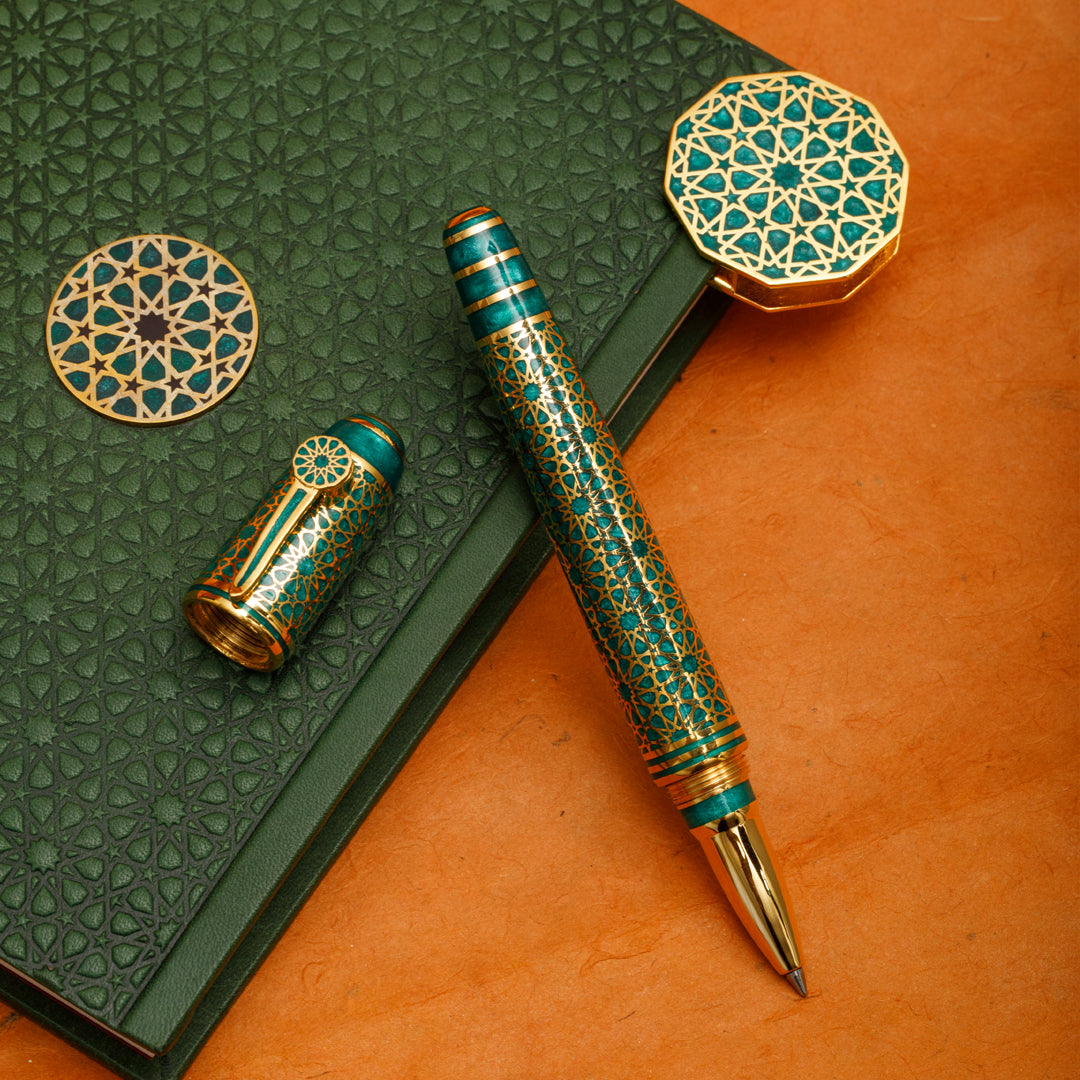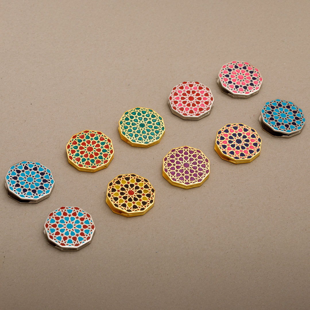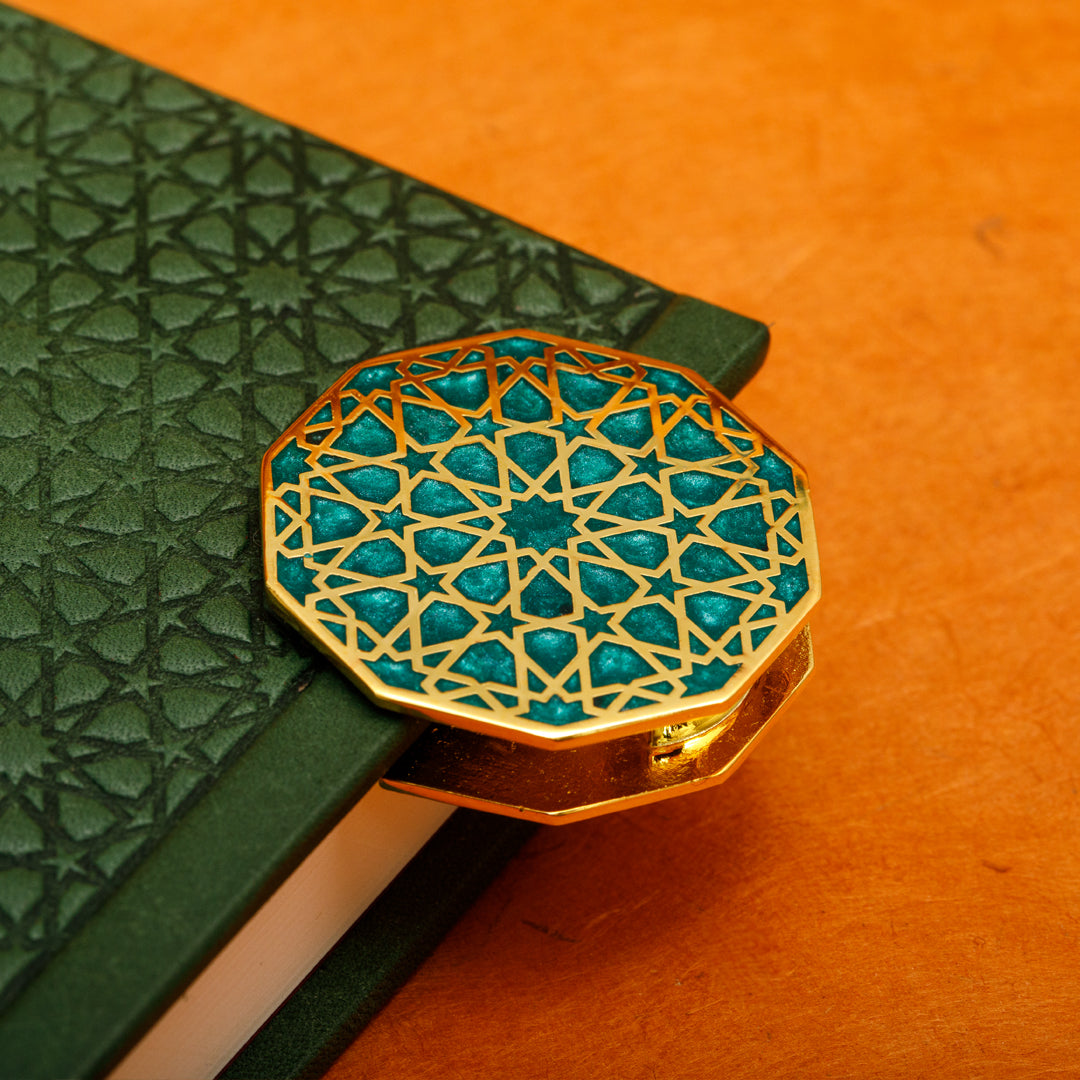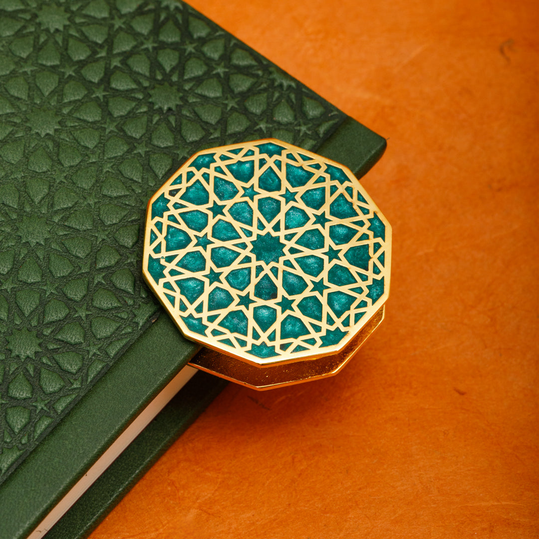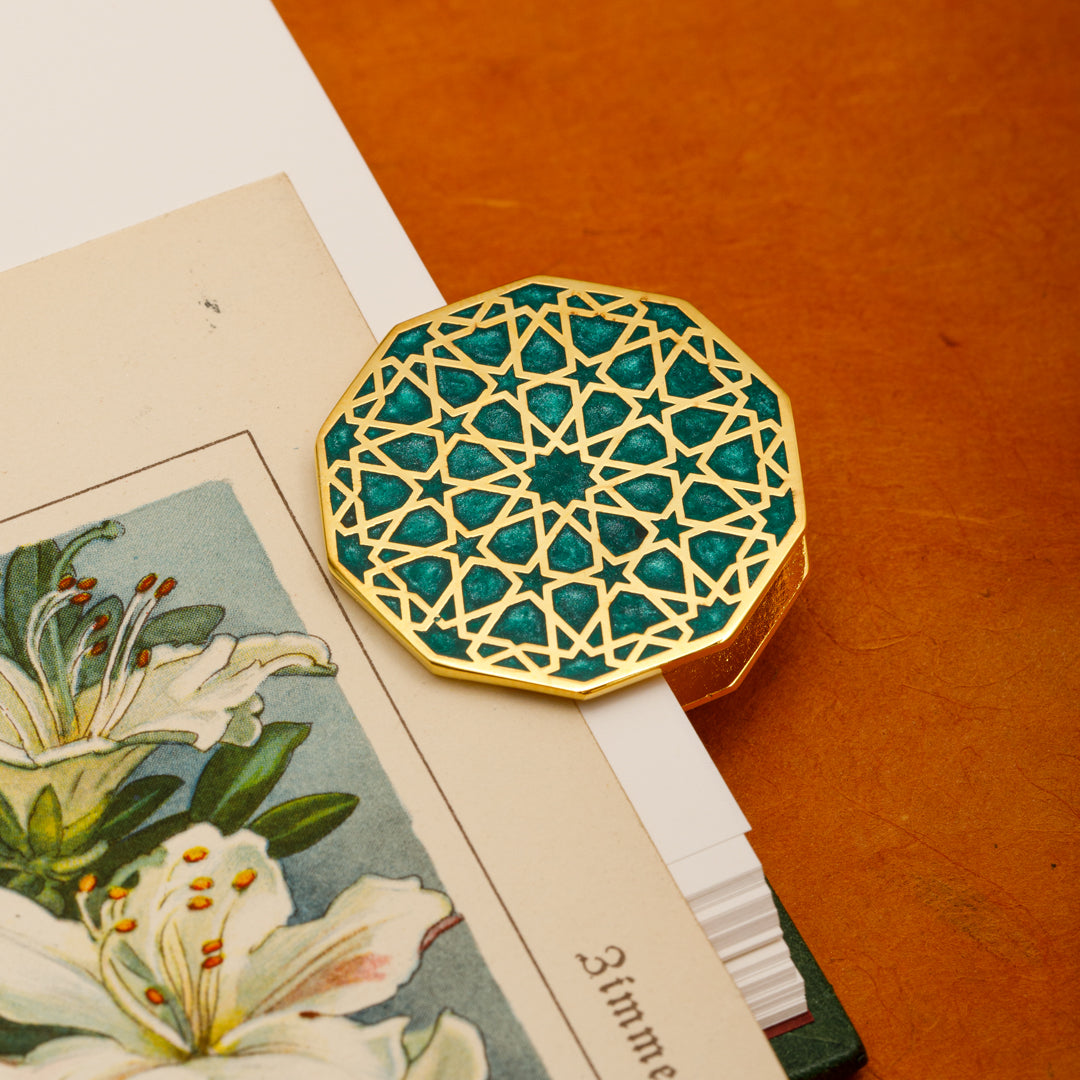 Ongen formdaki bu klips, kağıt tutucu; pirinç materyal üzerinde yeşil minesi ve nikel kaplaması ile sadece işlevsel değil; aynı zamanda estetik bir duruşa da sahip. Selçuklu taş ve çini işçiliğinden ilham alan geometrik yapısı, her bakışta geçmişe bir selam niteliğinde. Özellikle ongen form, Selçuklu mimarisinde cennet tasvirinin simgesi olarak kullanılır; kubbelerde göğe açılan bir geçit gibi yer alır. Bu çokgen yapı, dünyevi olanla ilahi olanı buluşturur. Biz de bu formu, sözlerin, düşüncelerin ve tarihin bir araya gelip saklandığı bu küçük ama anlamlı objede yeniden yorumladık.