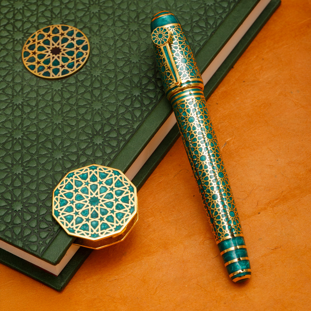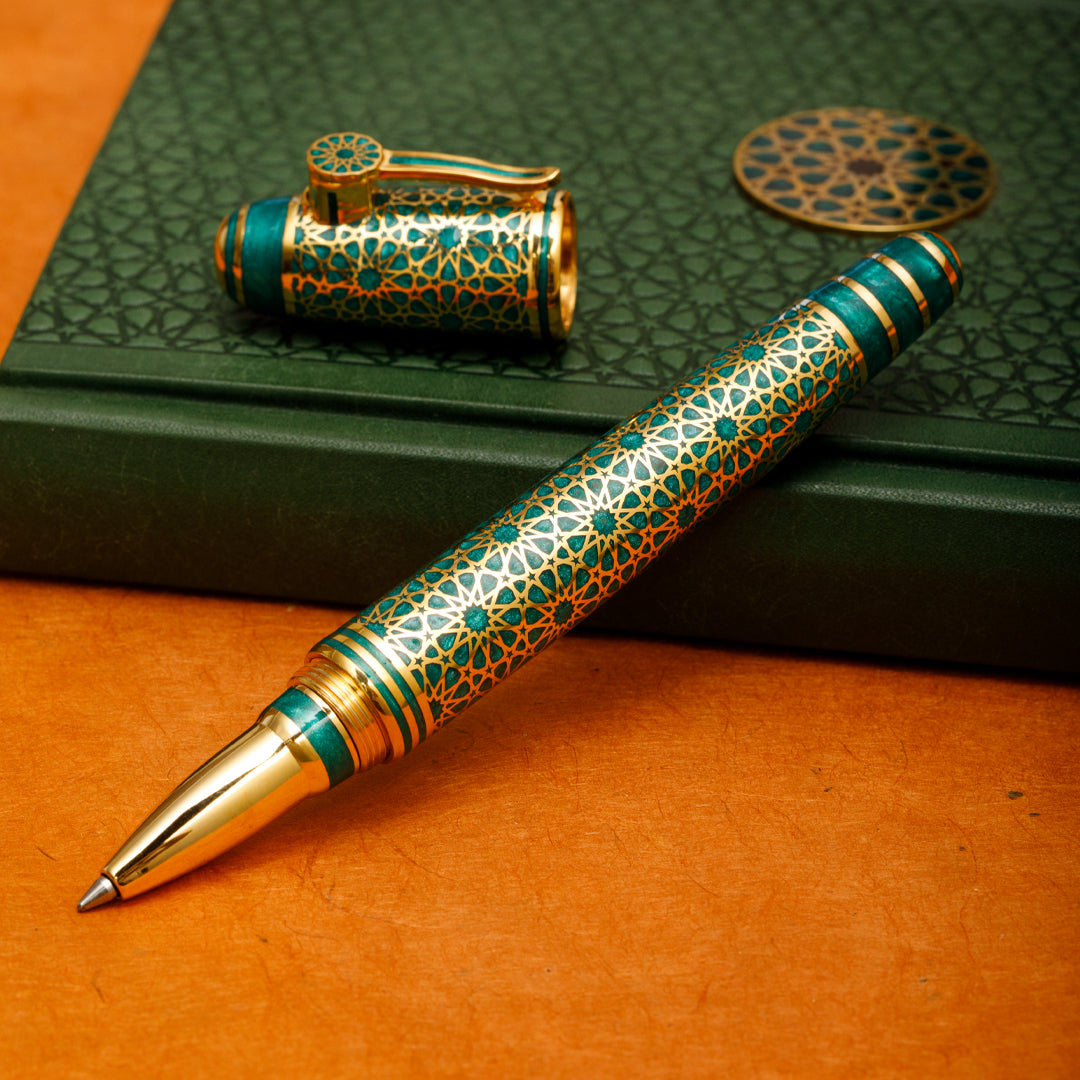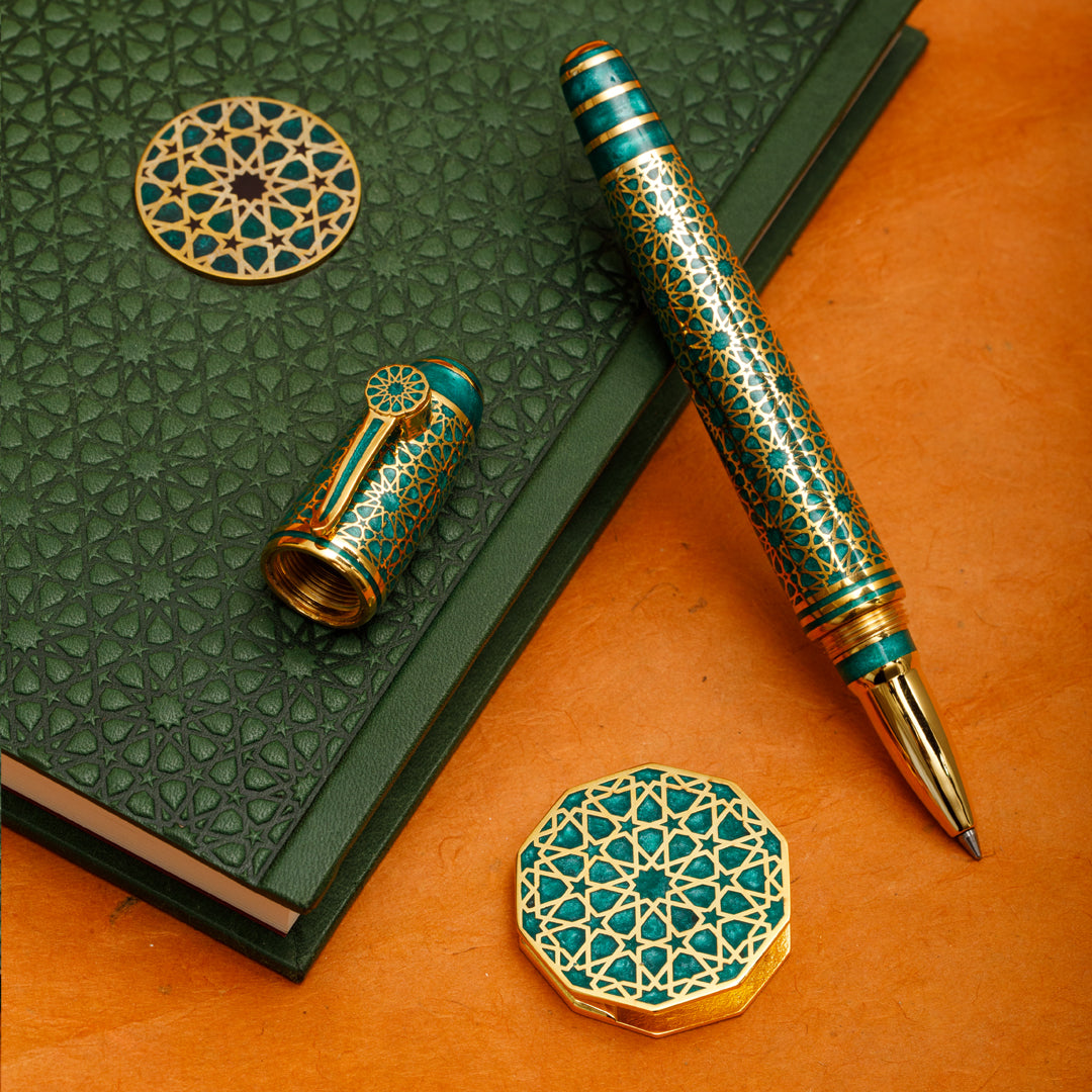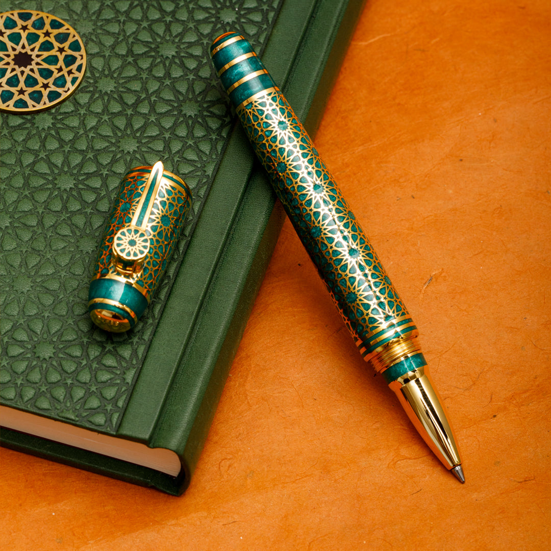 Zümrüt yeşili, doğanın kalbinden gelen en derin çağrıdır. Bu roller kalem, yalnızca bir yazı aracı değil; içsel huzurun, bilgeliğin ve sadakatin sembolü olarak tasarlandı. İslam ve Selçuklu estetiğinde cennet, sonsuzluk ve ruhsal dengeyle özdeşleşen yeşil, bu kalemin üzerinde sizi sakinliğe ve anlam arayışına davet ediyor.Selçuklu’nun taşve çini işçiliğindeki incelik, doğu kültürünün derinliği ve doğanın kendi döngüsüyle birleşerek bu eserde hayat buldu.