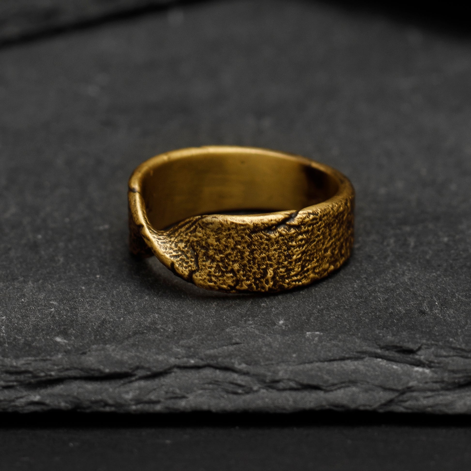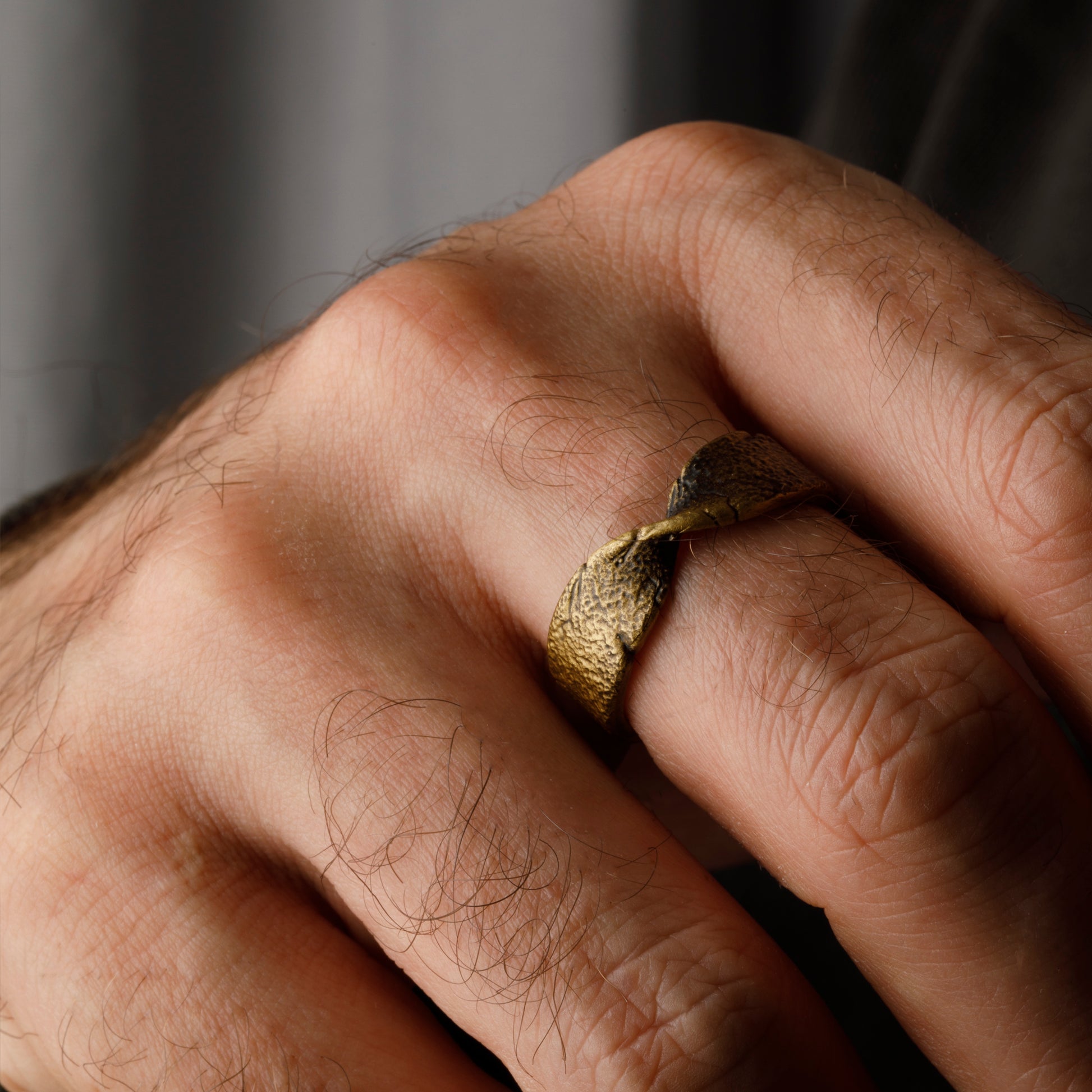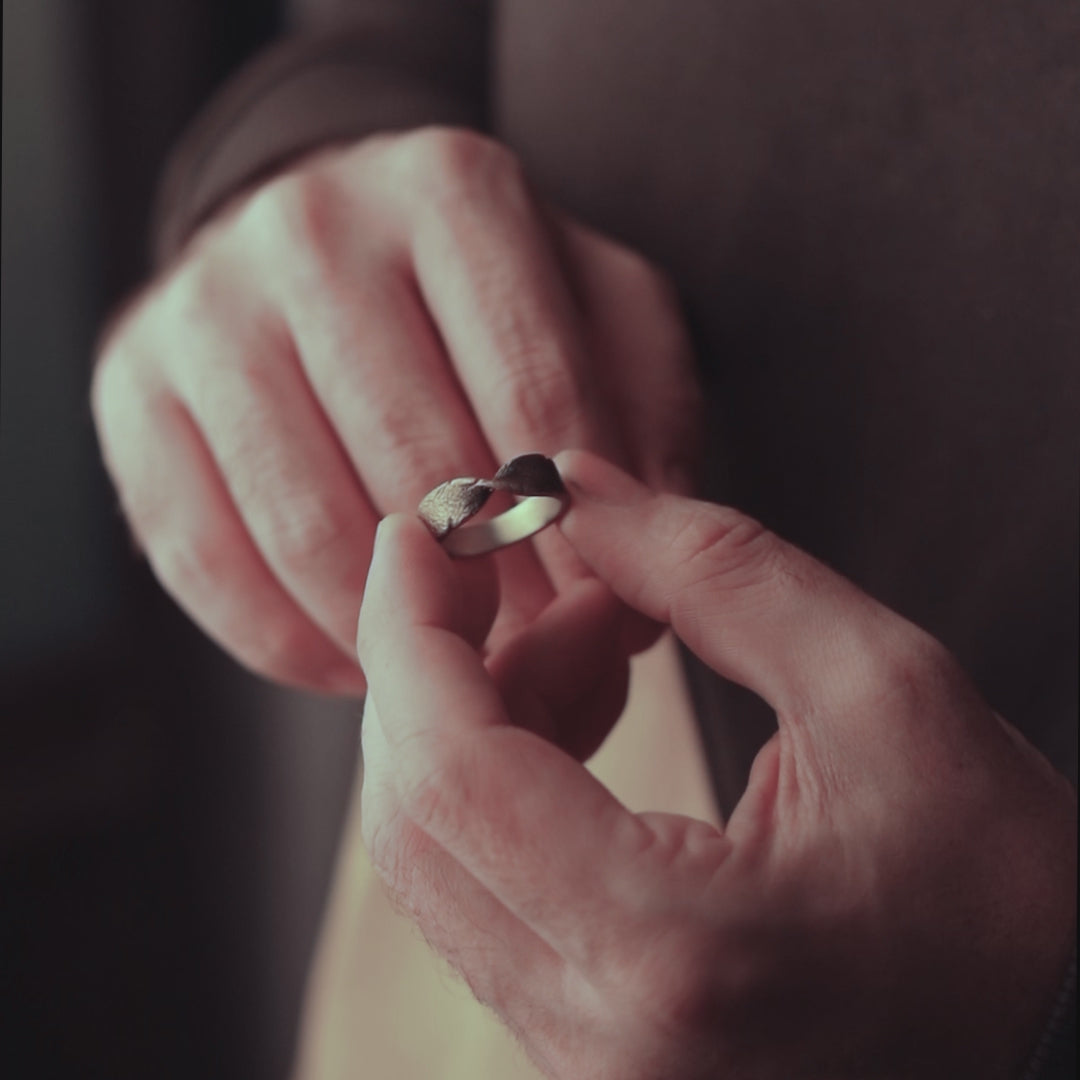 Mobius şeridi yüzük yorumunda kesintisiz tek yüzeyden oluşan ve dönmeyen formuyla yaşamın döngüselliğine ve iç içe geçmişliğine işaret eder. Yüzeyindeki kusurlar ve dokulu yapı, tüm yaşanmışlıkları ve hayatın bıraktığı izleri yansıtır."